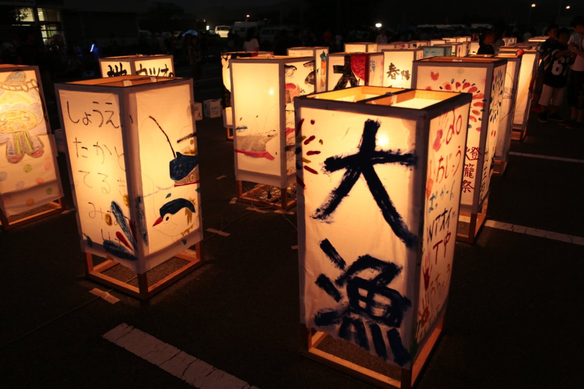 イベント会場での催し物は毎年変わり、今年は地元の子どもたちが作成した箱型燈籠を飾り付け、尾鷲ヒノキのプレートを使って「祝 令和元年 燈籠祭」の文字を完成させるのだそうです。 他にもステージイベントなども用意されています。