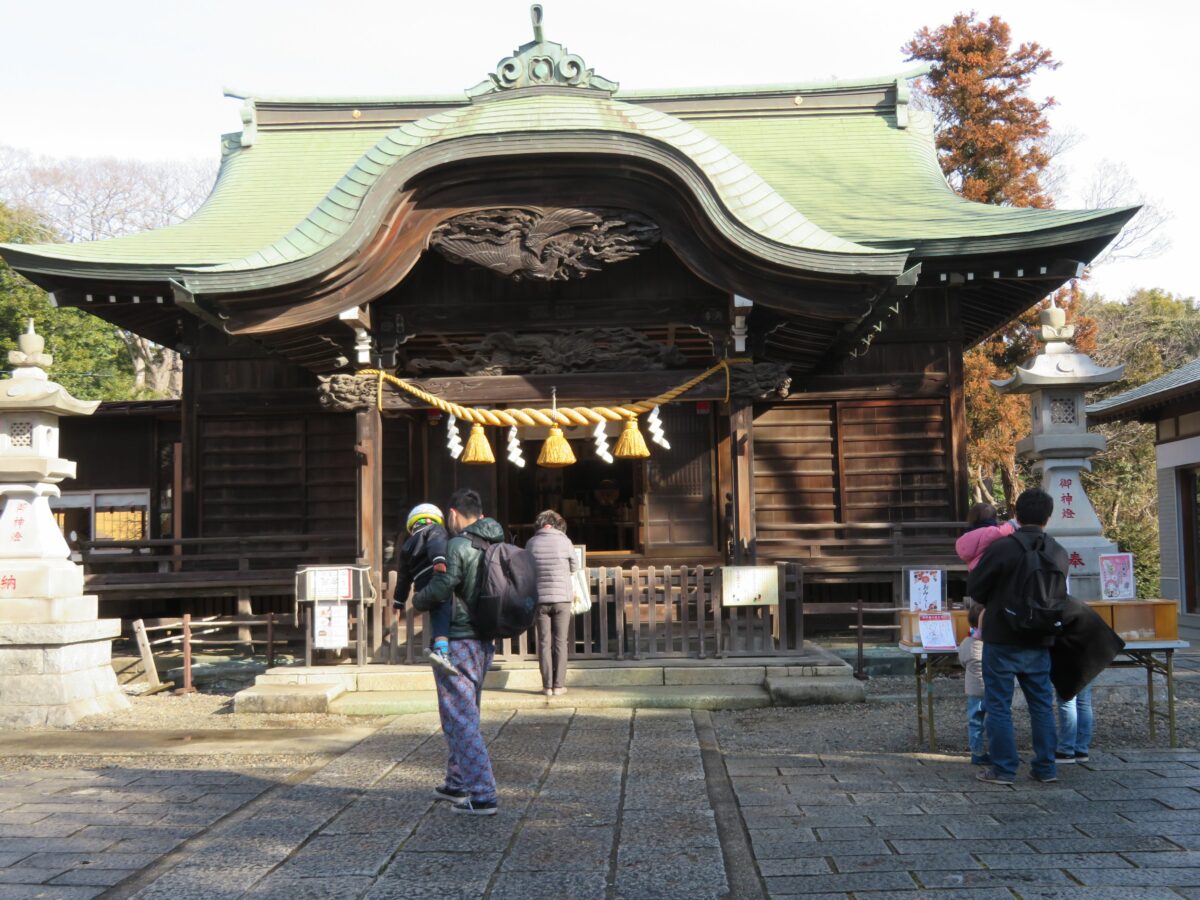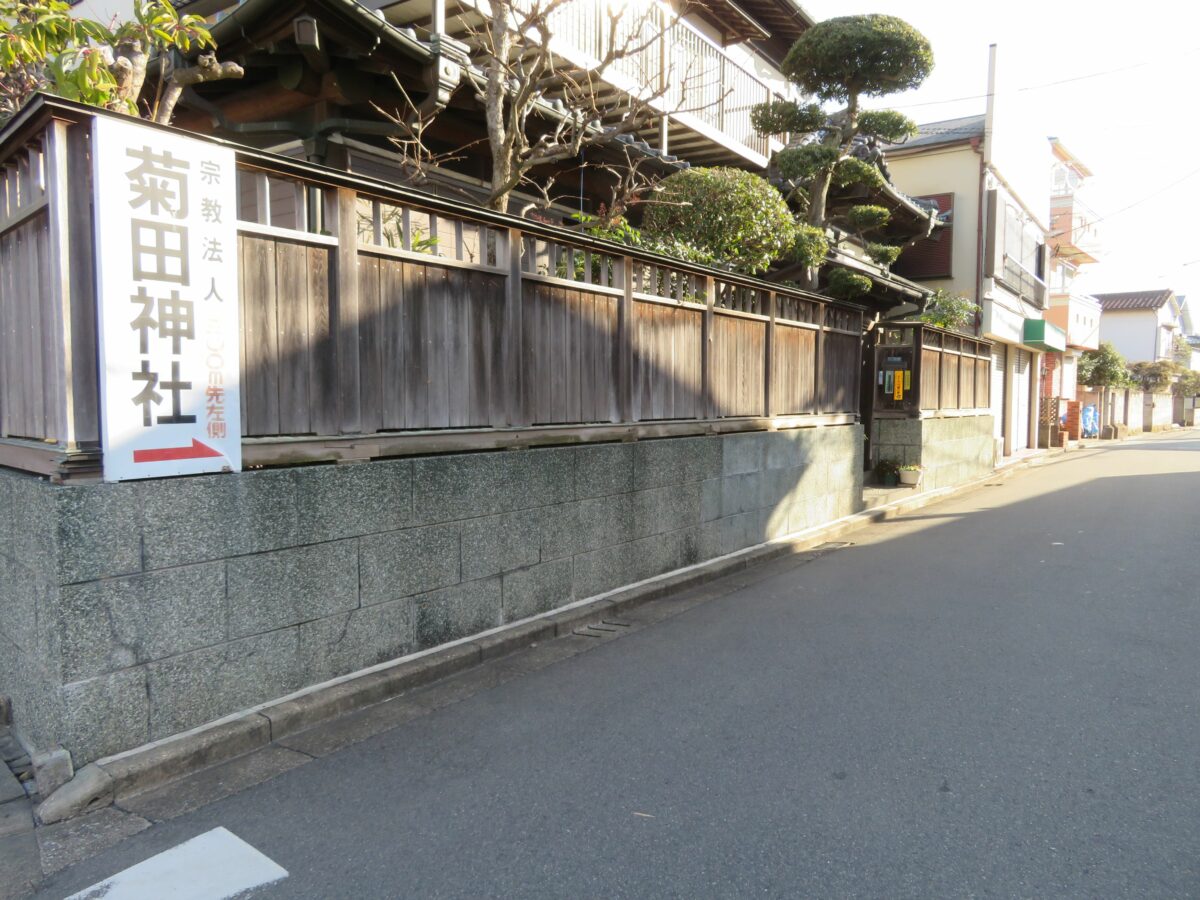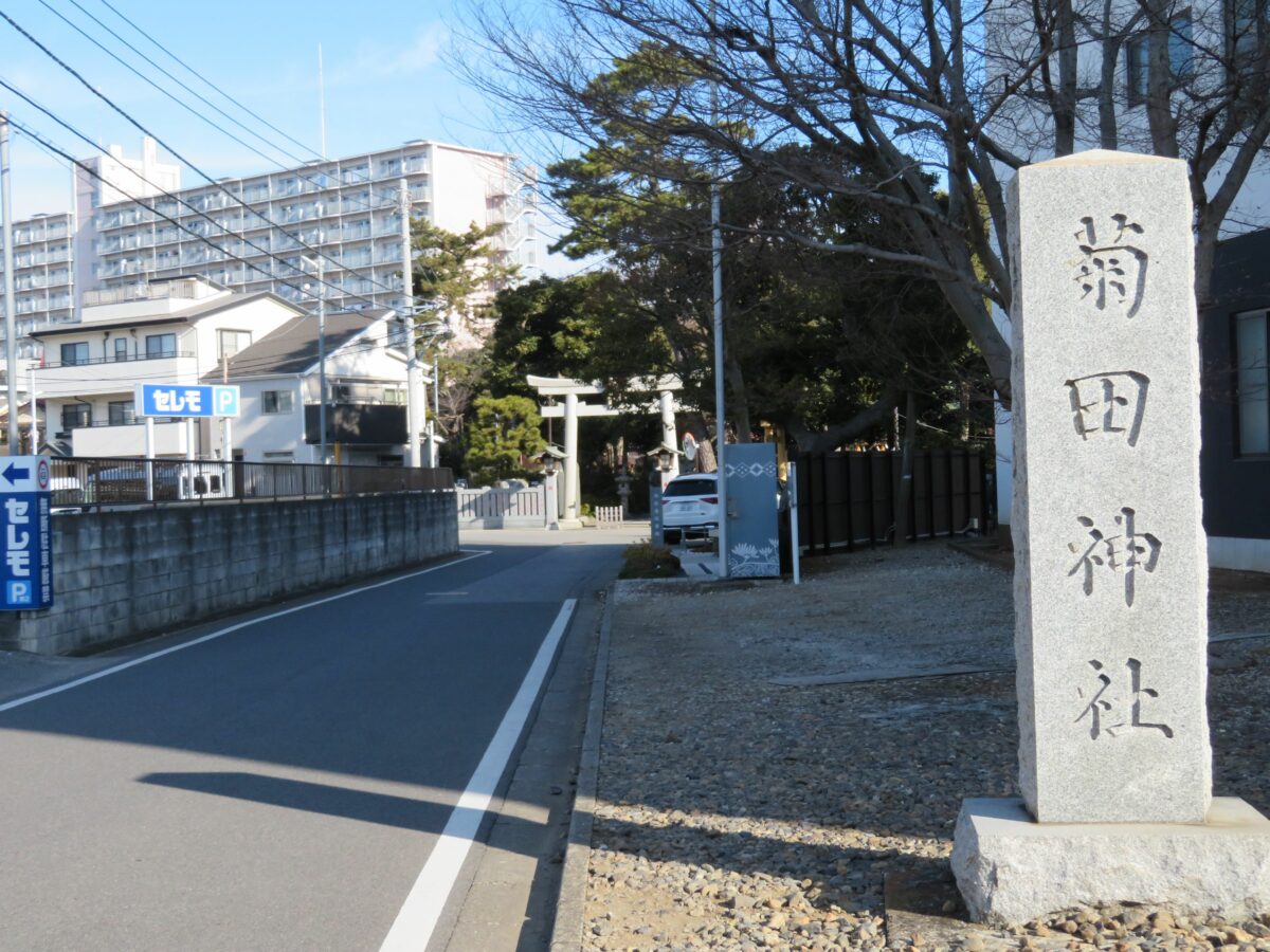 菊田神社は京成津田沼駅から東300メートル足らずのところに社殿を構えています。駅舎の北側の道案内に従って数分歩くと社号碑が神社の鳥居に導いてくれます。