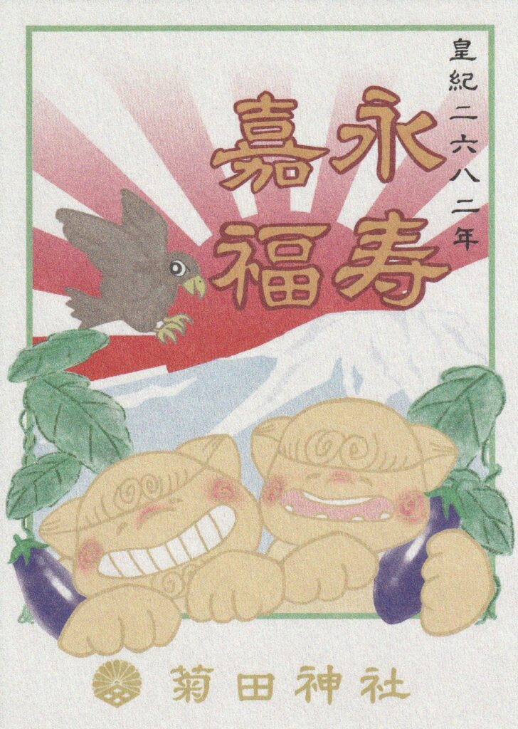 千葉県習志野市の菊田神社では、通常の御朱印の他に月替わりの御朱印が充実しています。「アイーン狛犬」などがカラフルでユーモラスなデザインで描かれます。