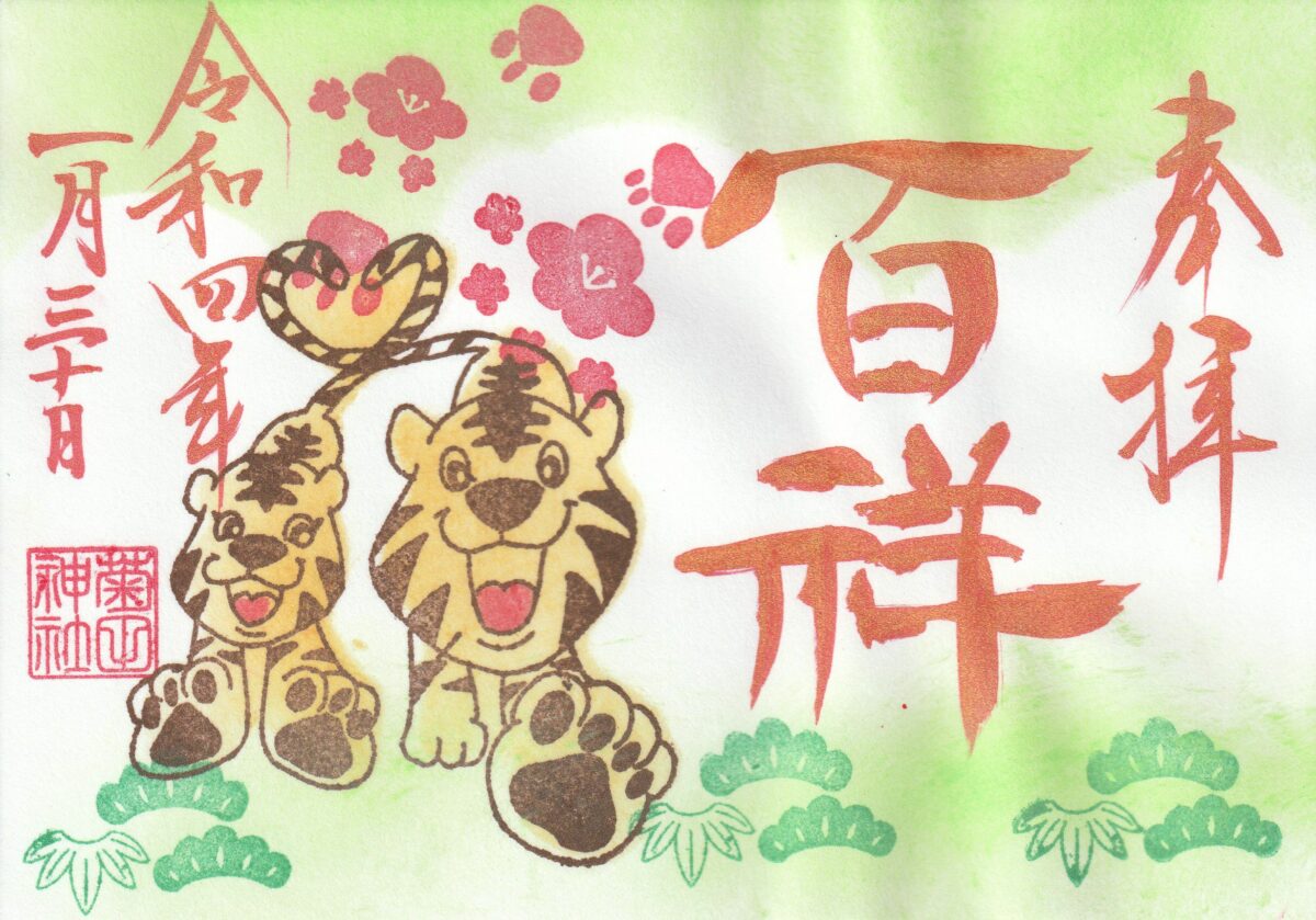 通常の御朱印の他にも、月替わりの狛犬の御朱印、月詣の御朱印などが準備されています。いずれもカラフルでユーモラスなデザインが施されます。各種の御朱印には皇紀年に永寿嘉福の文字が記されたシートを頂くことができます。