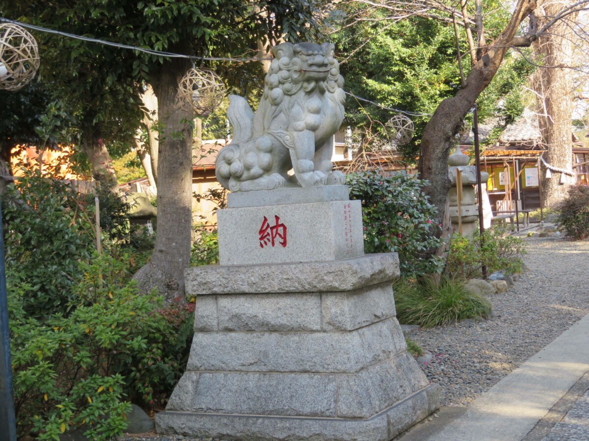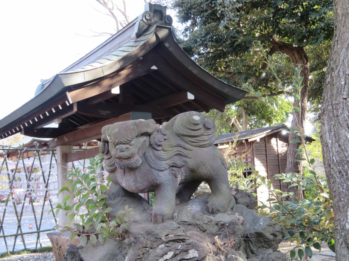 菊田神社の大きな特徴は、拝殿と鳥居を繋ぐ参道の両側をはじめ、境内に表情豊かな狛犬が設置されていることでしょう。月替わりの姿で御朱印に描かれるのですから、神社のマスコットと言えるかもしれません。中には、「アイーン狛犬」の愛称がつけられたものもあります。2020年に新型コロナに命を奪われたコメディアンの志村けんさんのバカ殿の姿が蘇ってくるようです。