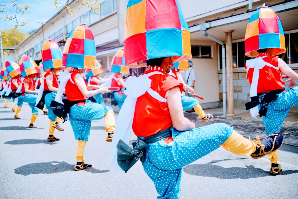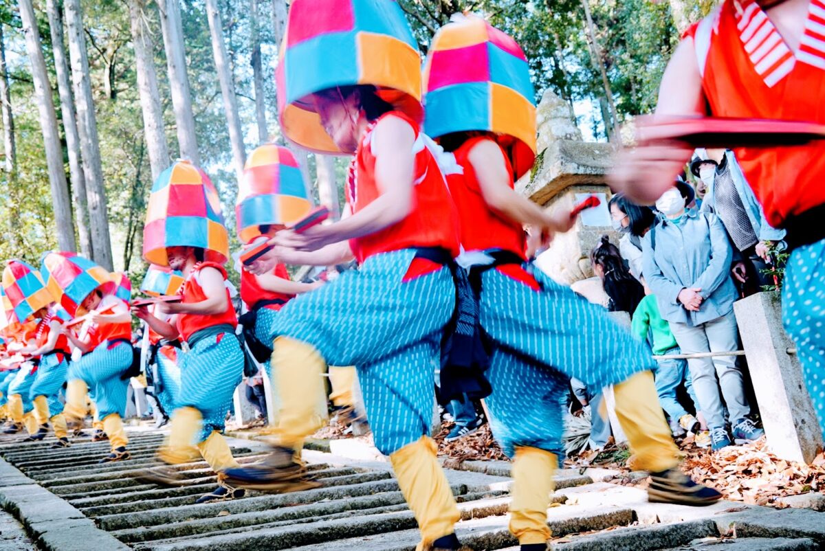 安弘見神社を目指して2キロの道のりを歩きます。先導役の鬼や天狗に続いて杵振りたちが堂々と登場。笛と太鼓の音に合わせ、「ソーイ」「ソーイ」のかけ声とともに杵をクルクル回しながら円を描くようなステップで踊ります。統制が効いた群舞がエモい。