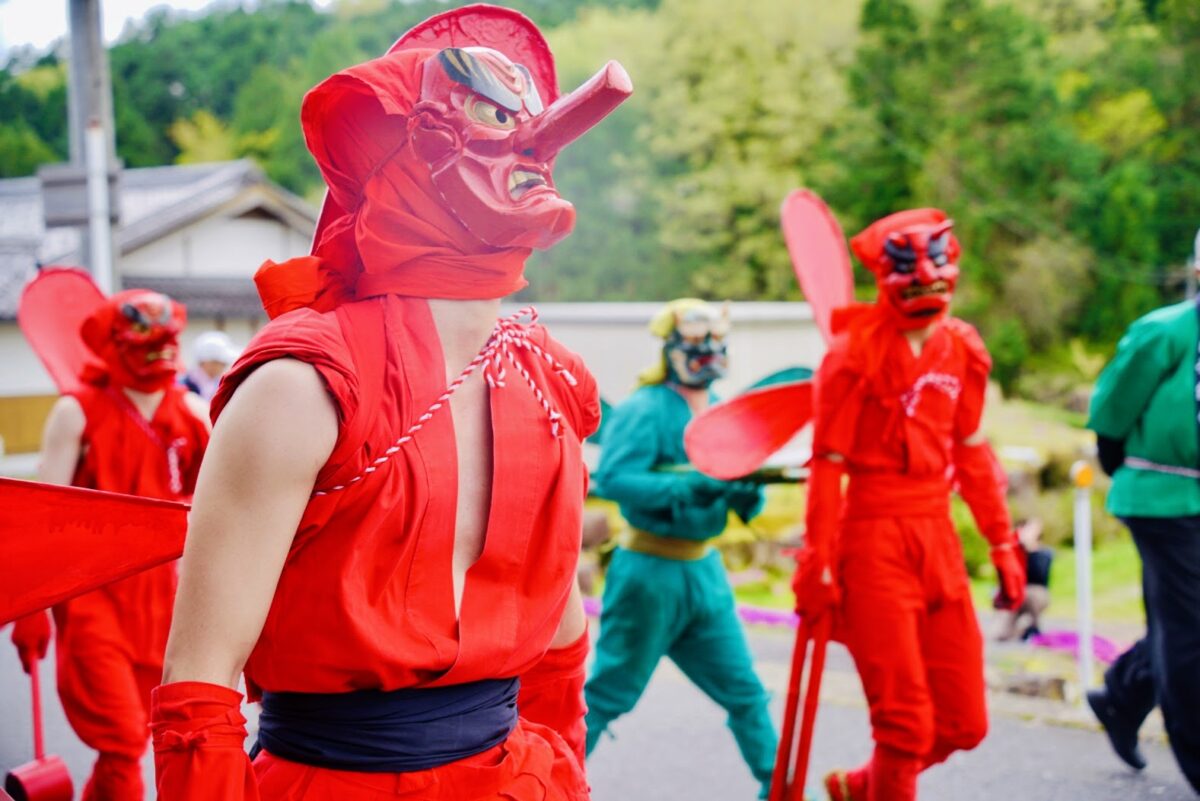 赤鬼・緑鬼:行列の先陣を切り、竹の棒をバシバシやりながら踊る。「トンボ」と呼ばれるプロペラ形の3枚の羽が生えた造形が斬新過ぎてやばい。「はっ!群体化して大陸間飛翔も可能か!?」と妄想したくなるレベル。山崎敬子先生の「都道府県別 にっぽんオニ図鑑」にも登場。