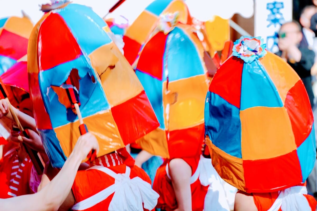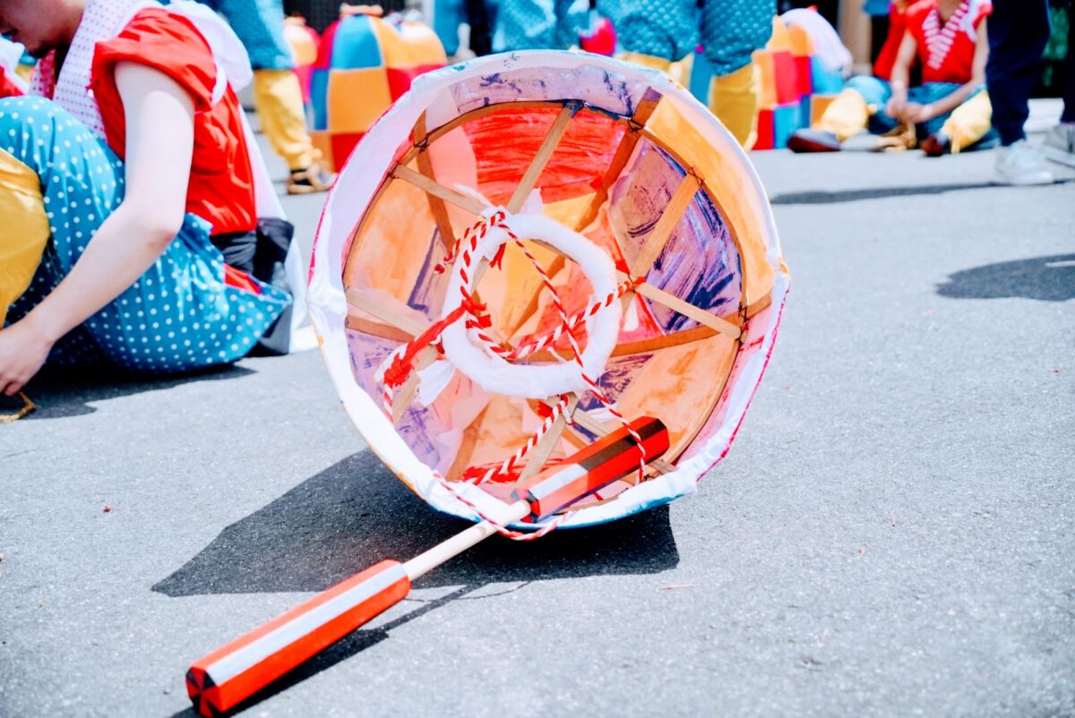 ヘルメットを被る要領であごひもを締める方式になっているのがわかります。傘は穀物をつく臼を表し、赤は勇気、青は優しさ、黄色は知恵を体現(トライフォースかよっ!)。また踊り子がバトンのように振り回す杵は、豊年増産の象徴なのだとか。