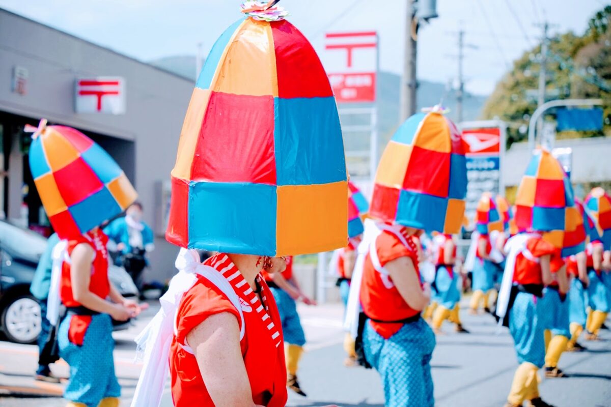 赤いはっぴに白いたすきをかけ、水玉模様のかるさんに黄色のはばき姿というファッションで、50人近くいる踊り子の担い手は10代後半~20代の若者が中心のようです。