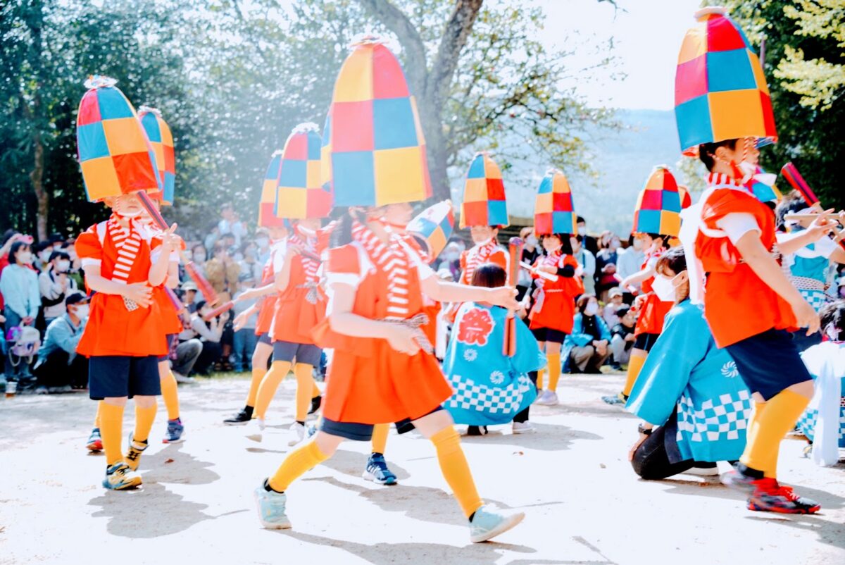 ゴール地点である安弘見神社の麓には、屋台が立ち並び、大勢の人でにぎわっていました。また広場では、地元の小学四年生40人たちによるちびっ子杵振り踊りも披露。ほっこりしますわ。