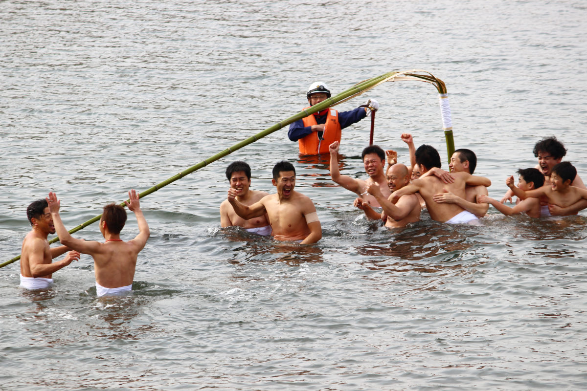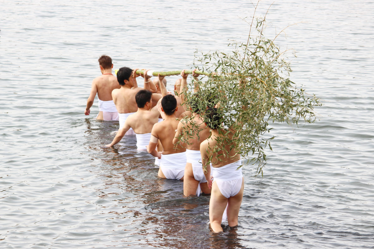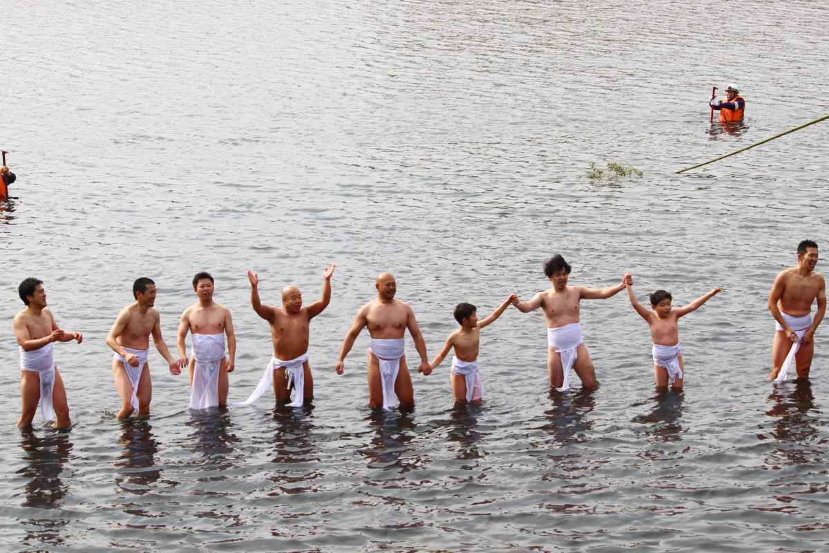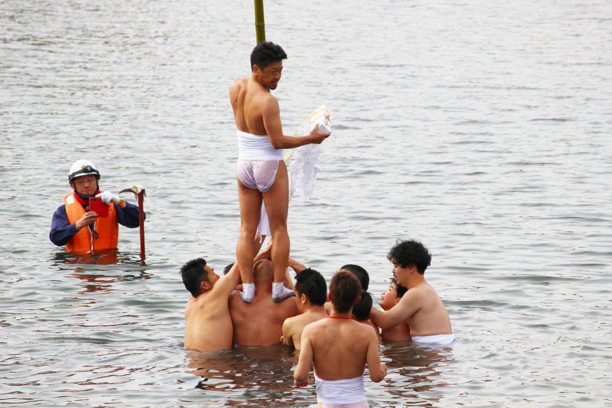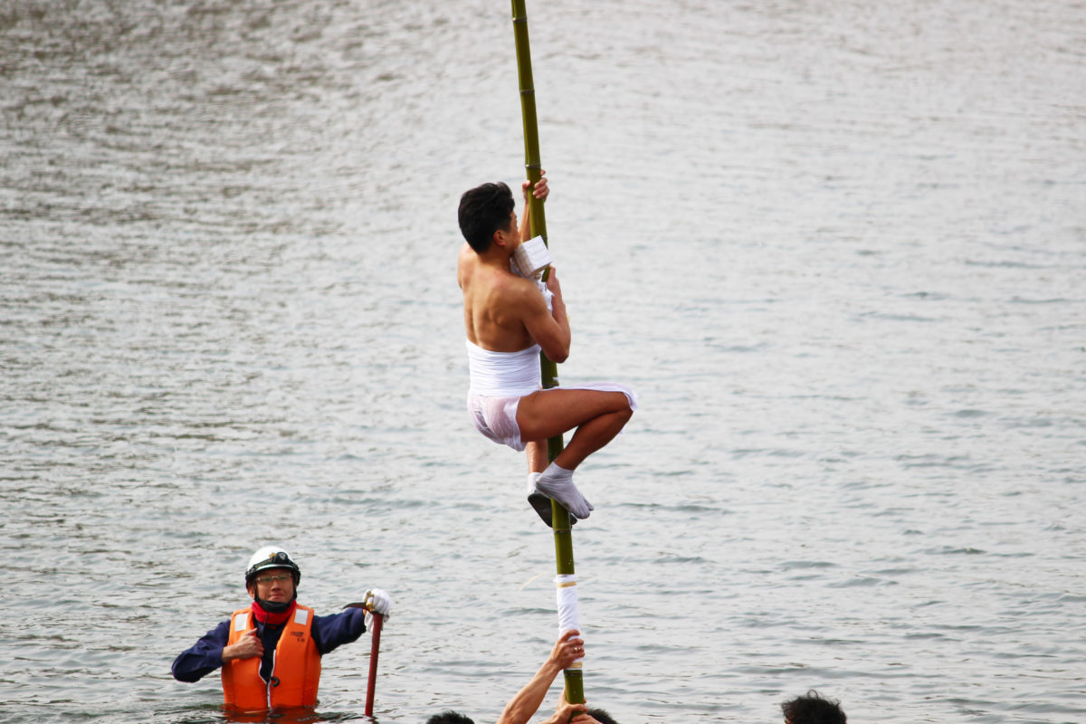 七所社からほど近い庄内川へ、竹を背負いダッシュで向かう男衆!川沿いで浴衣を脱いでふんどし一丁となり、いざ川の中へ進みます!
