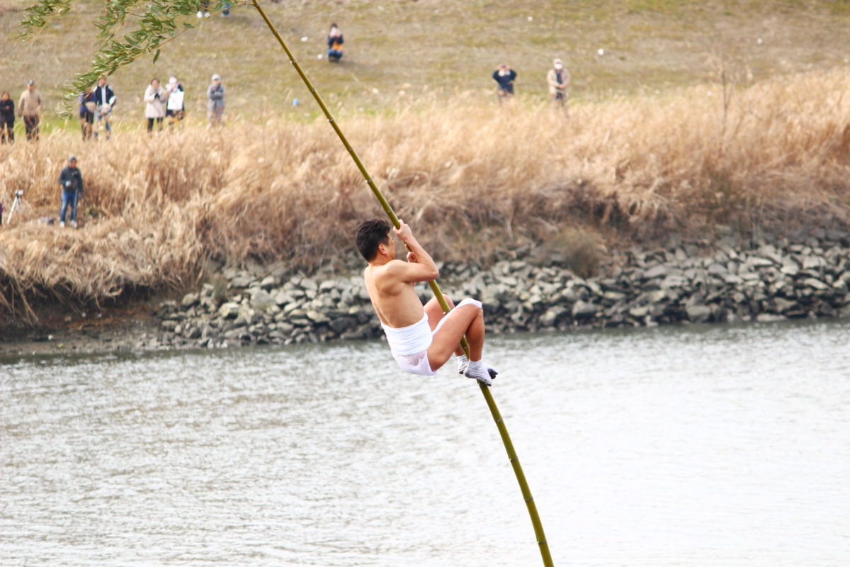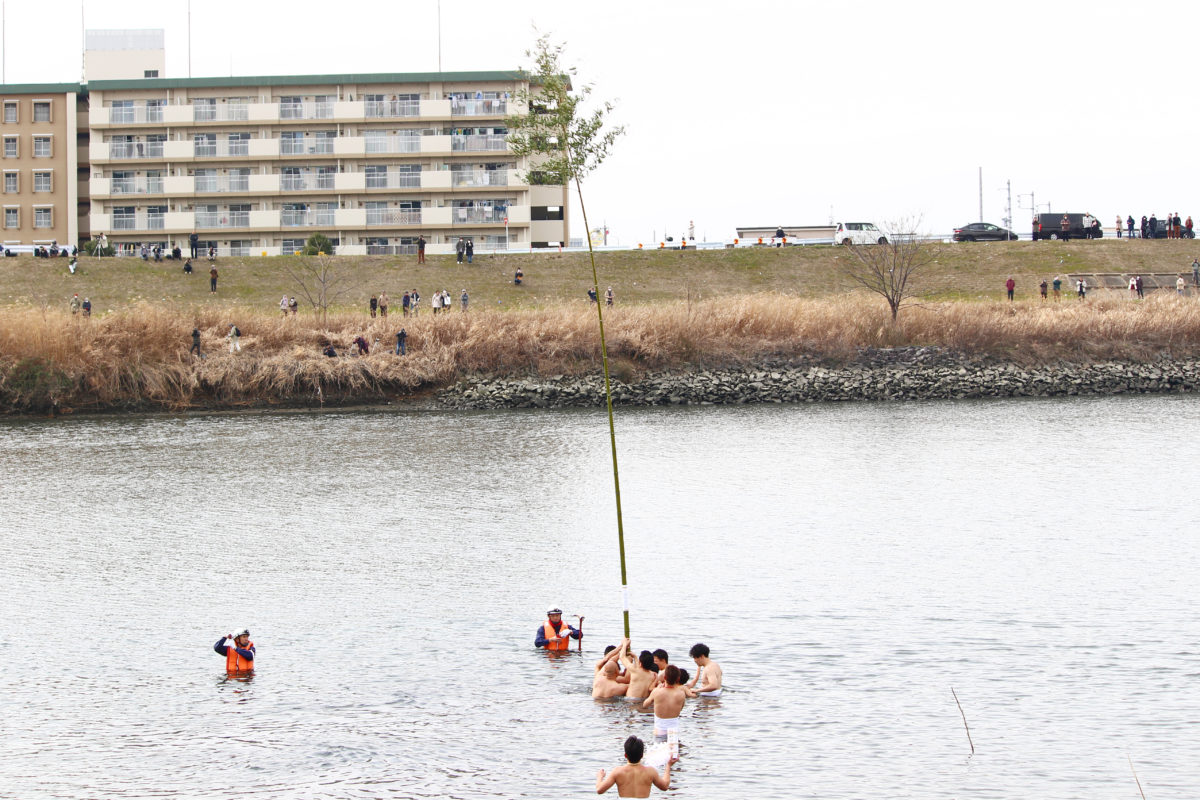 まだ2月、冷え込む時期の川祭り。寒そうですが、無事川の真ん中で天高く竹を設置できました!