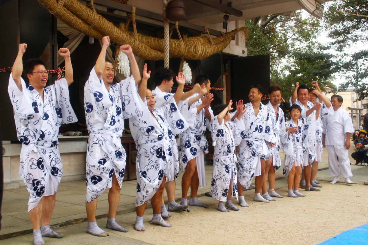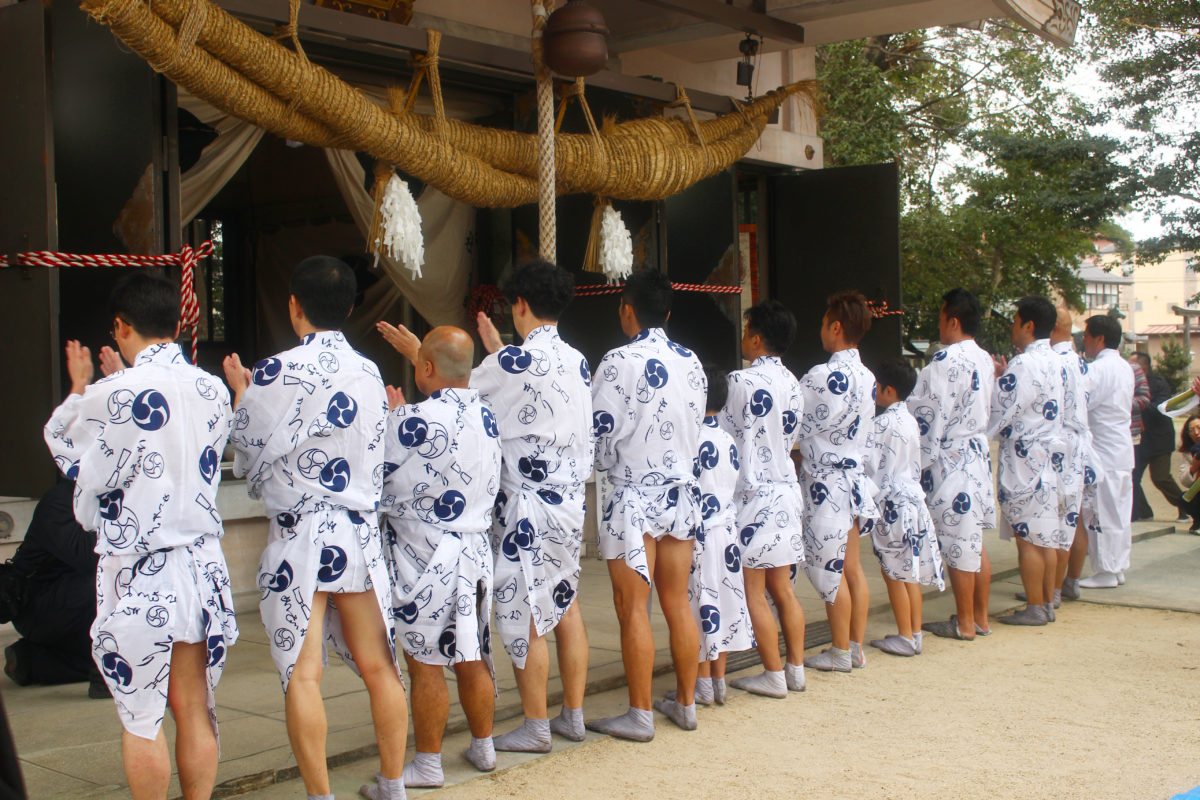 社殿の前に男衆が勢ぞろい。この男衆、後厄42歳の男性10名と厄年の子ども2名でチームが組まれているんだとか。この12名は役者と呼ばれ、一日中いろんな場面で活躍します。ユニークな制度ですね!