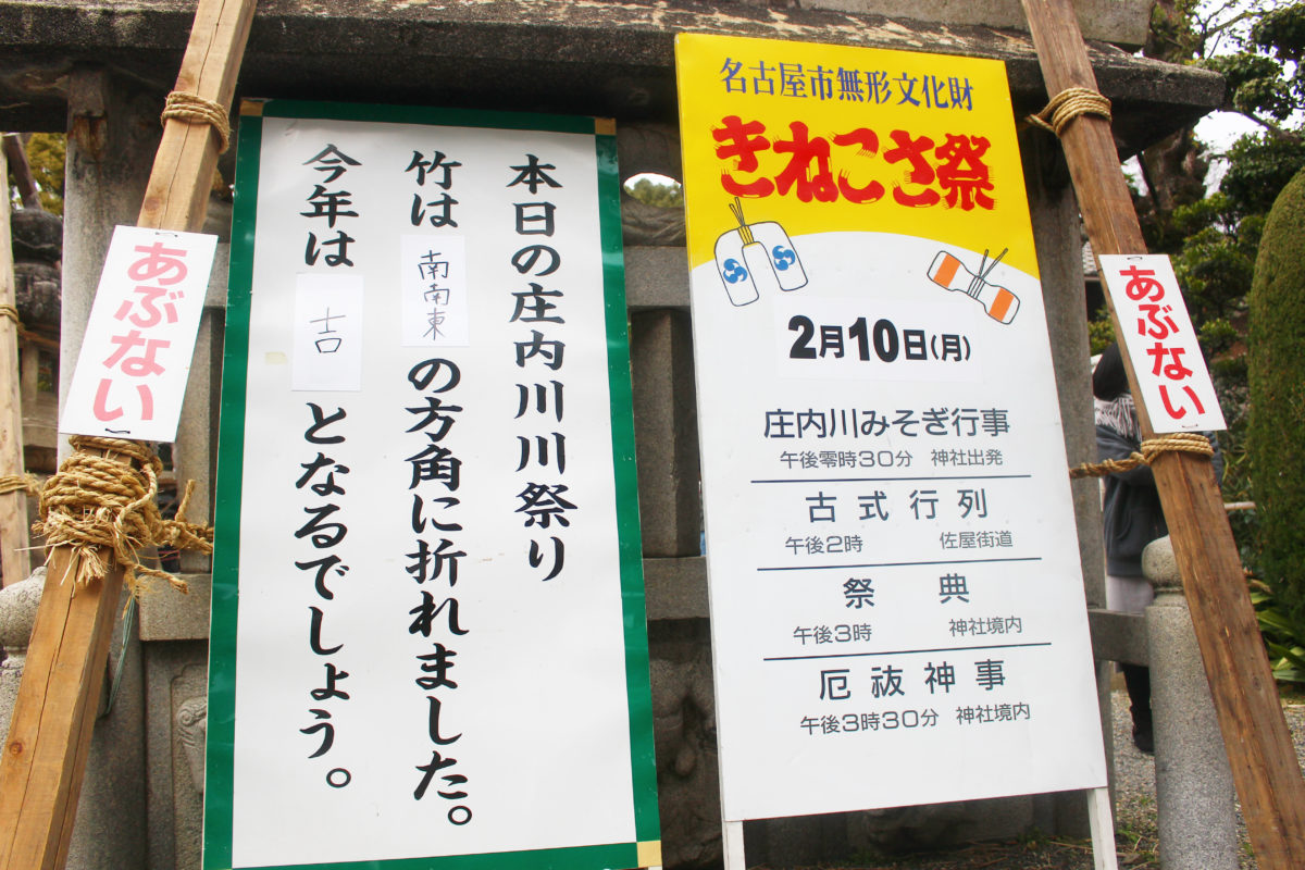 きねこさ祭は、熱田神宮の「歩射神事(ほしゃしんじ)」、尾張大國霊神社・国府宮の「はだか祭」と並び、尾張三大奇祭に数えられているお祭りです!「川祭り」、「古式行列」、「本祭り・厄除け神事」の3つのパートに分かれていて、見どころ満載な独特な行事が一日を通して行われます!