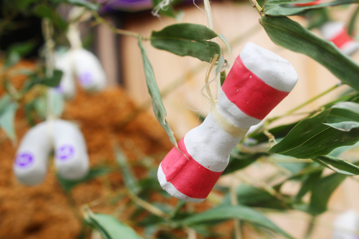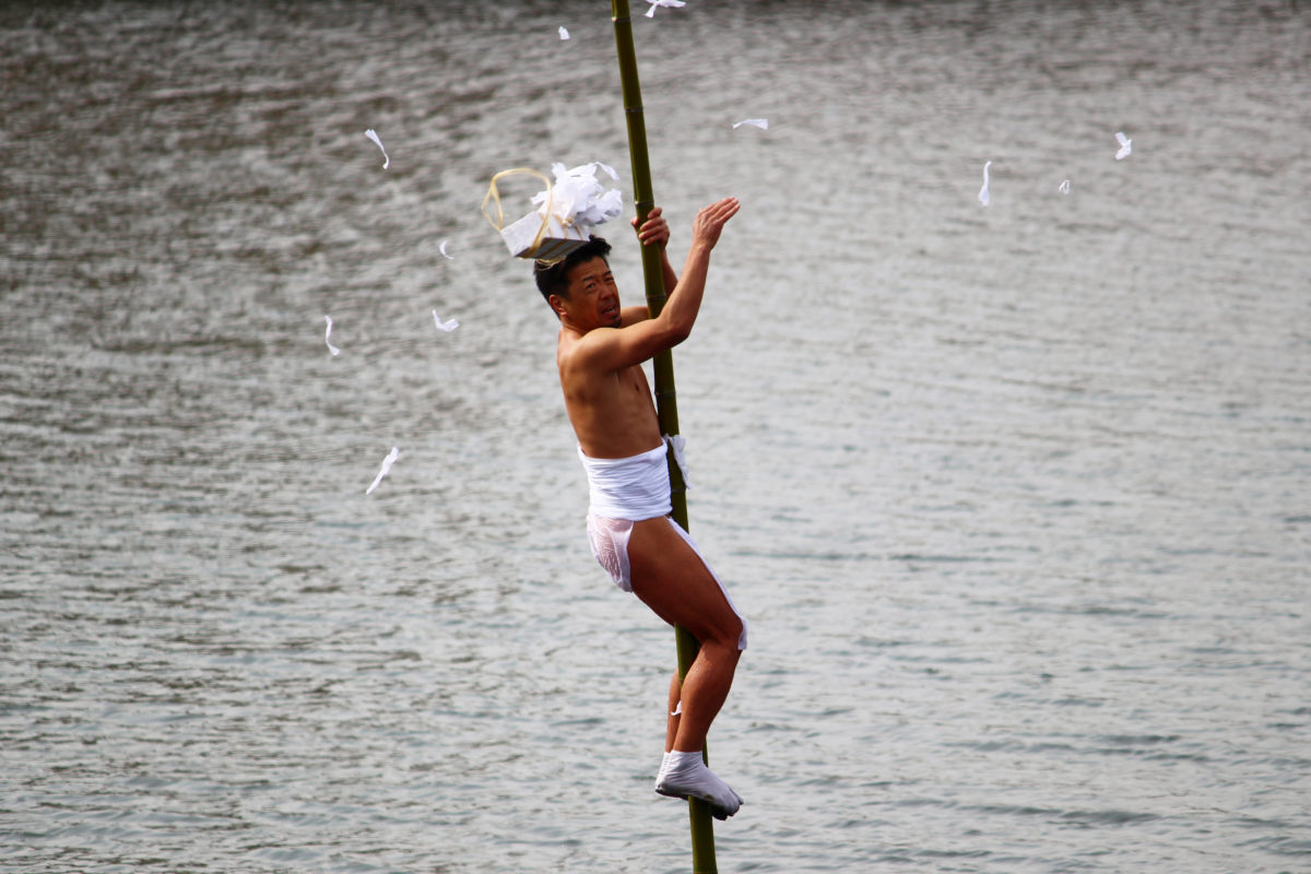 竹の中盤まで登ったところで御札をまき散らします!御札が、一本の竹の周りをたなびく様子が美しいです。