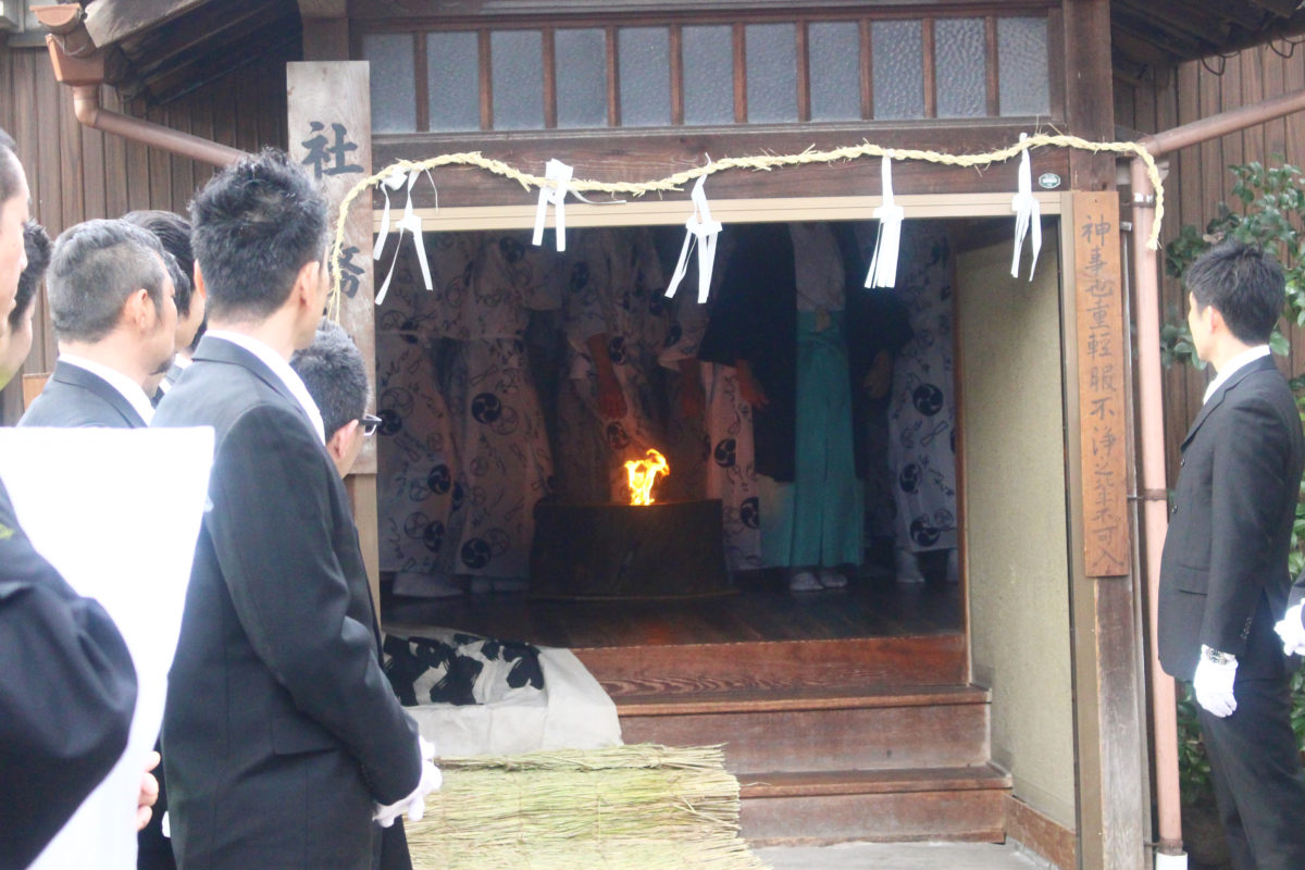 まずは浴衣を着た男衆が、社務所内で火を囲み儀式を行っています。田植えにまつわる口上を述べながら、火の回りをぐるぐる進みます!