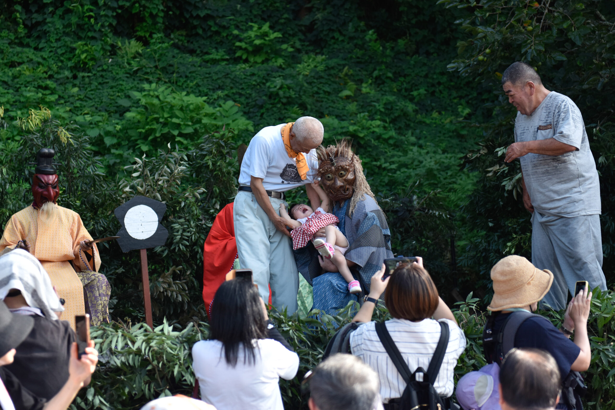 最初の「大序」の場面では、登場する鬼婆(おにばば)に赤ちゃんを抱いてもらうと健康に育つとも言われており、赤ちゃんを抱えた家族連れがカメラ片手に列をなす。「虫封じ」と呼ばれ、わめき声の原因ともなる「疳(かん)の虫が騒ぐ」ことを防ぐ意味合いもある。