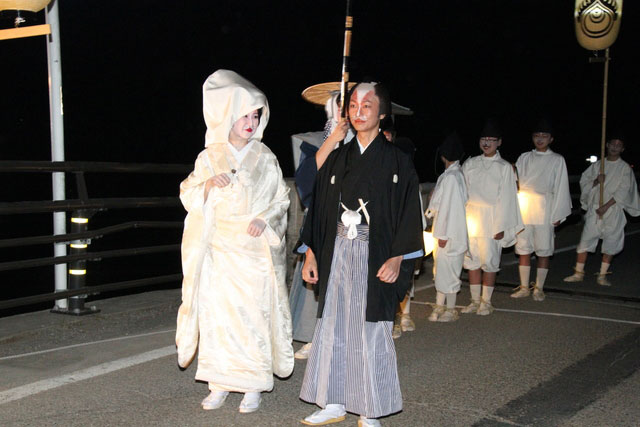 狐火で有名な津川に伝わる、江戸時代の嫁入りを再現した結婚の儀式「狐の嫁入り」。白無垢姿の花嫁が狐のマネをしながら夜の街道を練り歩き、108匹(人)のお供を連れて披露宴会場となる麒麟山公園まで行列する。町では灯りを消して松明や提灯で照らし出す幻想的な祭です。