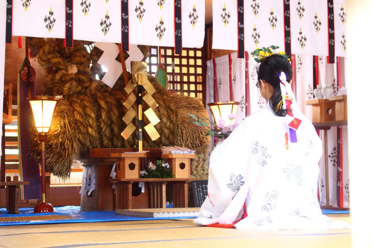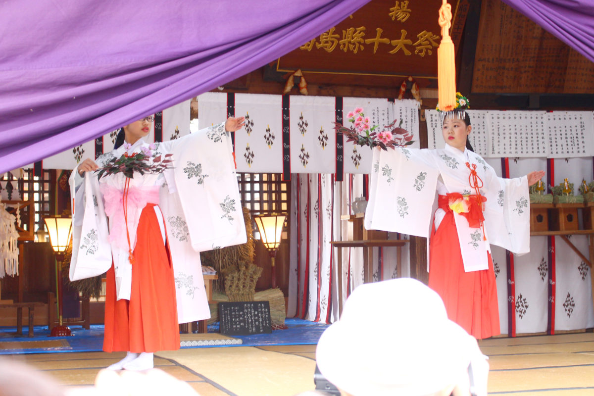 境内へ移ってみます。すると、地元の子による舞の奉納が行われていました。独特な衣装で舞っています!舞の後には、社殿に鎮座している”つつこ”へと祈りを捧げていました。