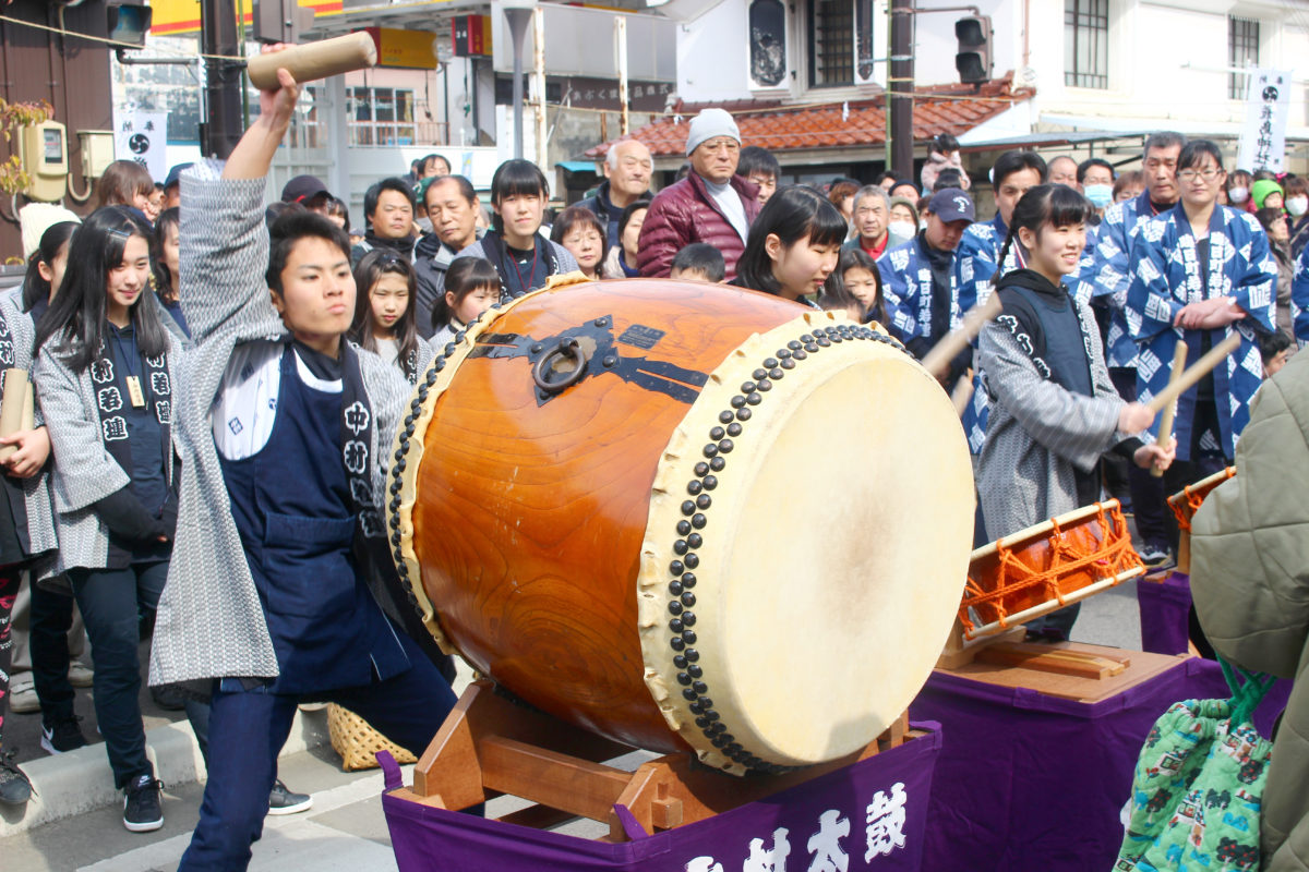時間は13時に近づき、神社への参道には人がびっしりと張り付き、つつこ引きのはじまりを今か今かと待っています。と、その前に、各町による祭り太鼓の披露が行われます。重低音で響く太鼓の音は、祭りに向けて気持ちを高ぶらせてくれますね!