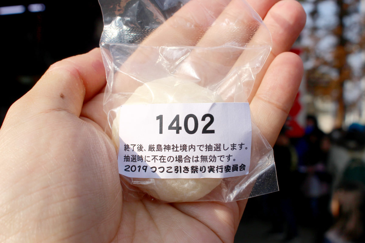 最後境内では、先ほど撒かれたお餅を使った「富くじ」、つつこでつくられたお餅の振舞が行われ、お祭りは終了となりました。