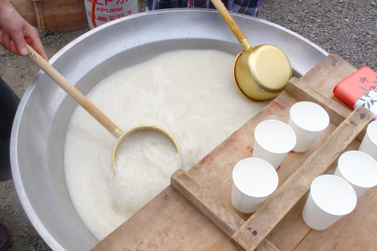 境内では、地元のお母さんたちによる甘酒の振舞がされていました。麹で作った甘酒で、ほのかな甘みがおいしい。祭りについて聞いてみると、12時に花火が上がりお祭りが始まると、まずは子ども綱引き、そして13時からつつこ引きがはじまるとのこと。時間になると、お清めを終えた男衆が参道の向こうから走ってくるそうで、これは見たほうがいいよーとのこと。13時を迎えるのが楽しみです!
