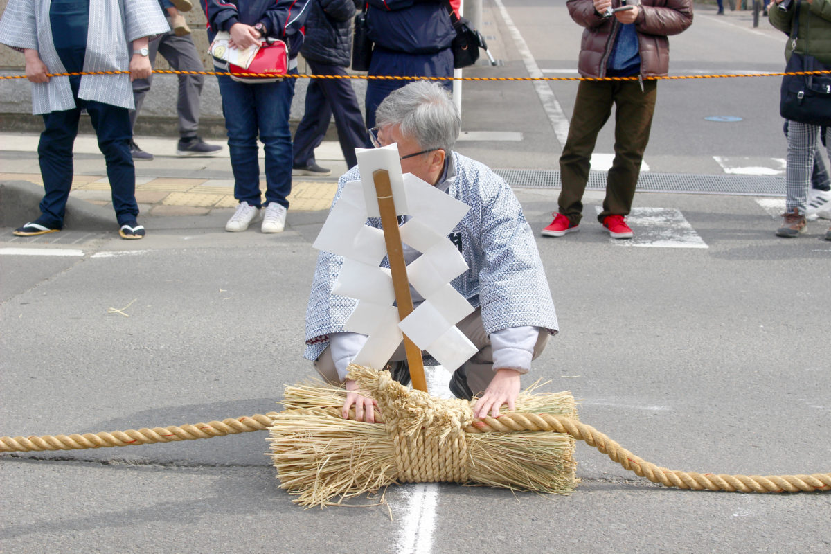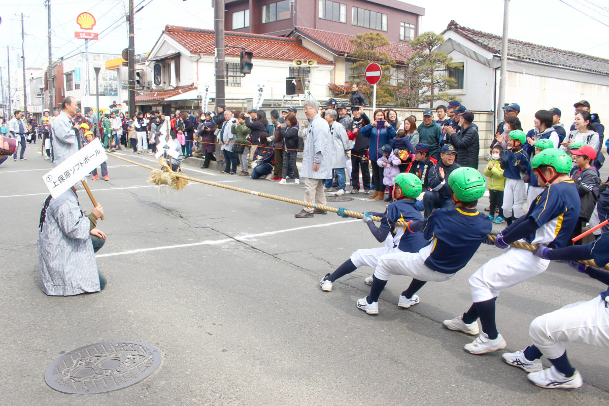 福男決めの後は、いよいよつつこの引き合いがはじまります。そもそもつつこをなぜ引き合うのかと言うと、実はこのつつこの中にはふかしたお米が収められているのです。上・中・下の3町が交代でつつこを引き、つつこの中に納められたふかしたお米を、お餅に変えていきます。このお祭りの発祥には、江戸時代にこの地方を襲った飢饉が関係しているとのこと。飢饉に悩み食べる用のお米だけでなく翌年の稲作のために残しておいた種もみまで食べつくしてしまった領民に対し、時の保原の領主だった松平出雲守が種もみを分け与えたところ、翌年は大豊作となったところから感謝の意を込めてはじまったお祭りだそうです。