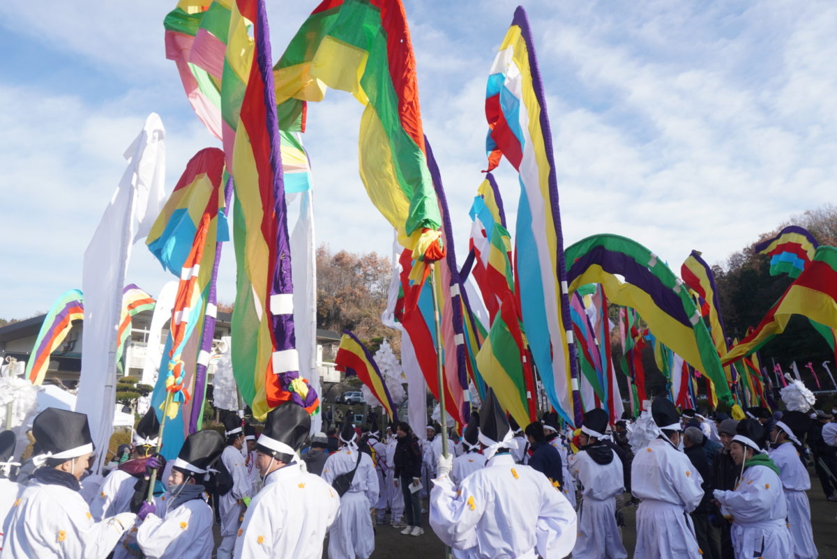 毎年12月第一日曜に福島県の二本松で開催。幡競争や餅つきをした後、100本以上ものカラフルな五反幡を押し立て法螺貝をふきながら山間の道をぬって木幡山をめざすというインスタ映えする奇祭。
