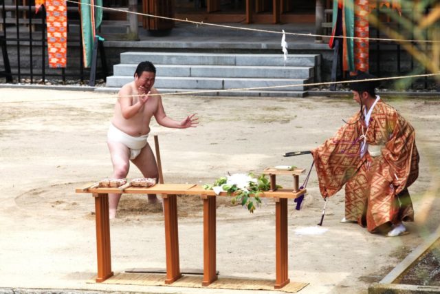 豊作を祈って、一人の力士が目に見えない稲の精霊と相撲を取る神事。まさに文字通りの「一人相撲」。また、16名の早乙女が白衣に赤襷、手甲脚絆という装いで田植えを奉仕する御田植祭も行なわれます。