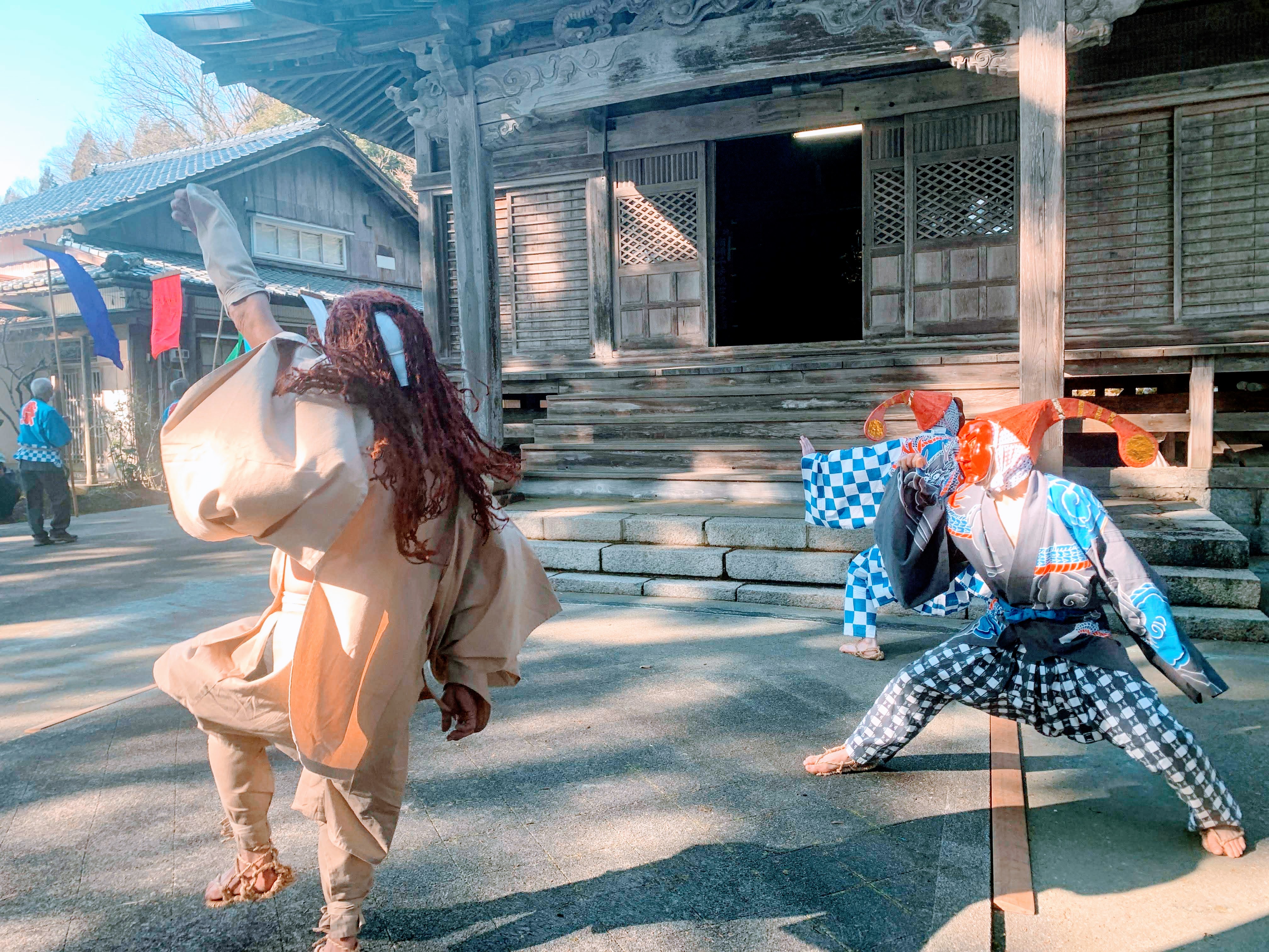 写真家のシャルル・フレジェが「YOKAI NO SHIMA」で撮影したというのもうなずける美麗なアート然とした衣装に身を包んだ2人の「ばば面」。その名もビッチャルとクソタレ。何でも2人はかつて命がけで村を救った英雄、森木三右ヱ門と十王堂(じょうど)六兵衛がモデルなのだとか。さらに女傑として名を馳せた鬼神のお松がモデルの「あまね面」や、ピョンピョン飛び跳ねる南蛮踊りを行う「天狗面」も加わり、獅子舞(二人獅子)に対して独特の獅子あやしを行います。平安時代から続く神仏混合の名残りを残す、古式ゆかしいオマツリです。