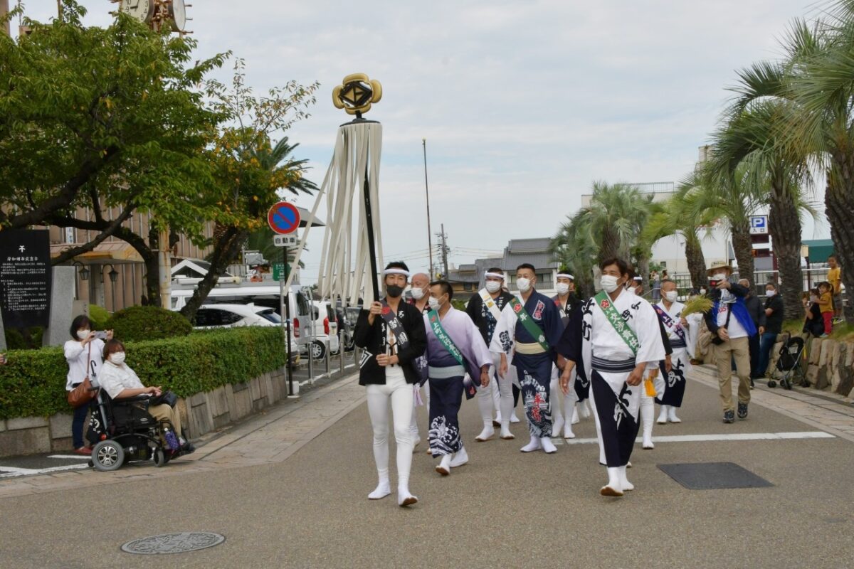 今年は、各町だんじりなしで纏を先頭に役員も各部署の責任者クラスに絞るなど、必要最低限と思われる人数で宮入りが行われました。