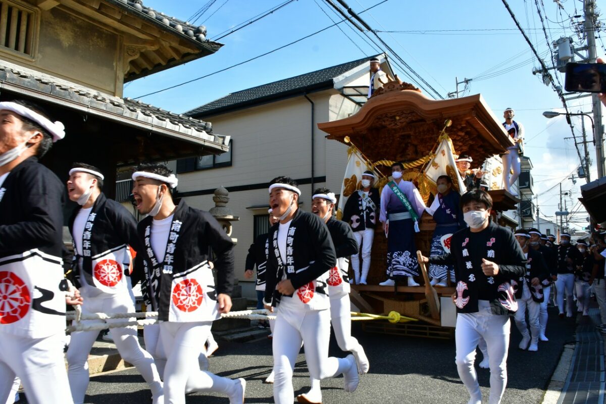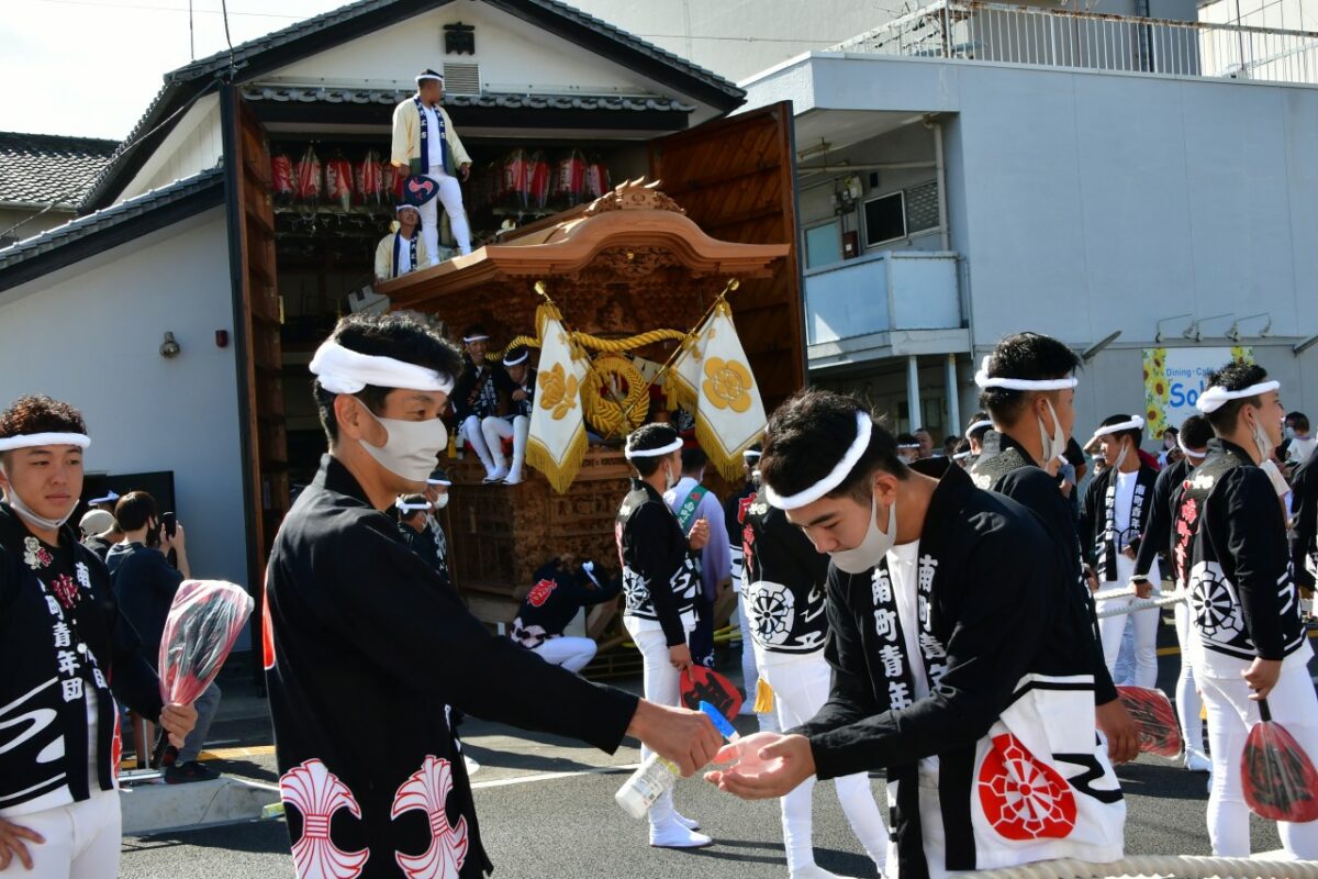 南町は9時頃にだんじりを移動させました。曳行中は熱中症対策のためマスクを外している人もいました。