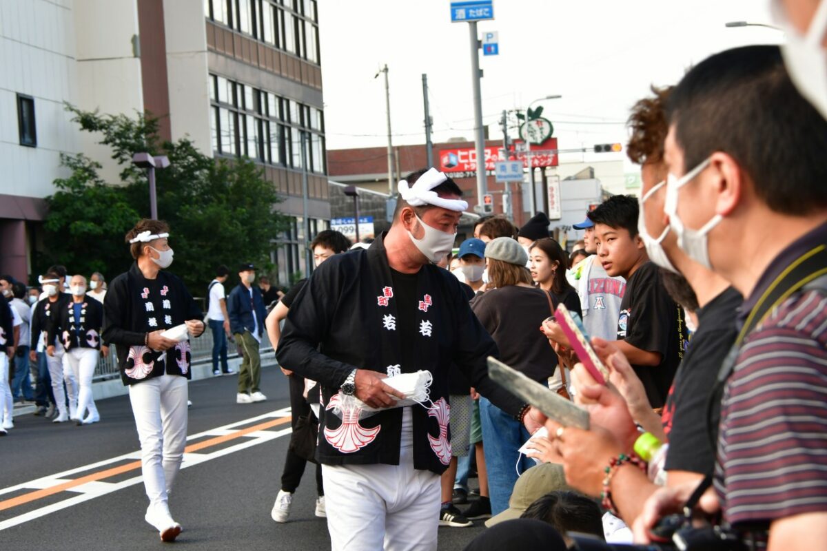 南町の入魂式ではマスクをしていないギャラリーに対し、マスクを無料で配布し、着用を促していました。