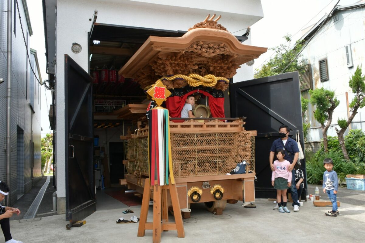 この後、紙屋町を覗いて見ると、だんじりは小屋横の駐車場に停まっていました。密を避けるため駐車場内は関係者以外立ち入り禁止でした。
