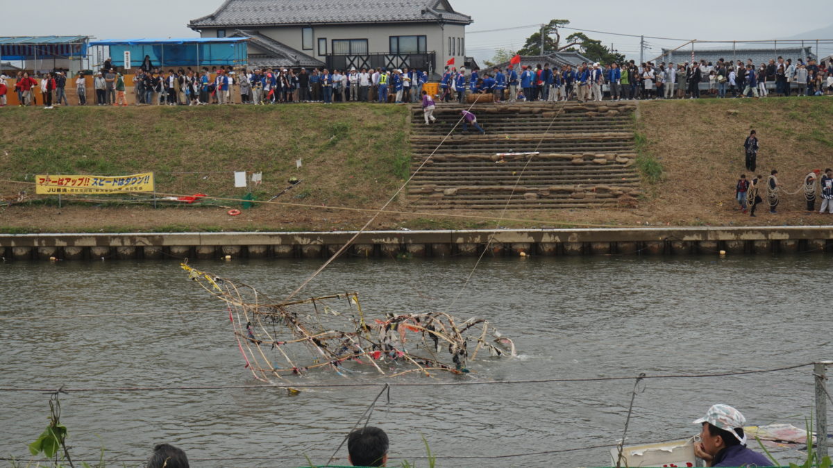 東軍の大凧に、西軍が上げた大凧が回転しながら急降下し、そのままふたつの凧は綱が絡まったまま川ポチャ!しかし、真の戦いはここからだったのです。