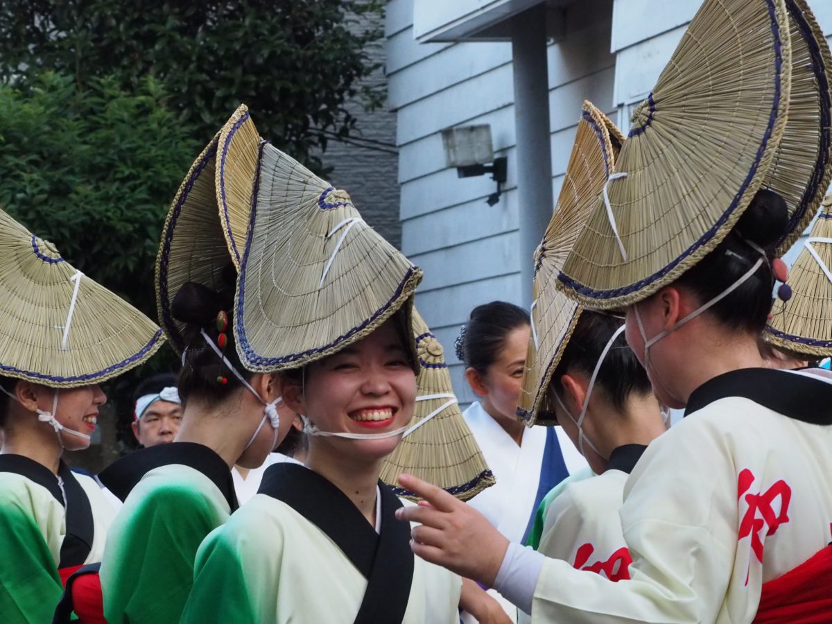 こんな時に感じる、頭に被る編笠のありがたさ。そして、こんな時、女踊りは思い切り襟を抜きます。もちろん色っぽさを出す演出ではあるのですが、事実、暑い!帯もガチガチに締めて、アスファルトの熱がこもる円筒となる衣装。襟を抜いて着るのは、暑さ対策でもあるのです。