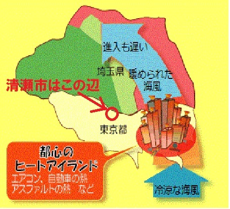 清瀬市が位置するのは、東京都と埼玉県の県境。都心の熱がガーっと流れ込むゾーンなのです。