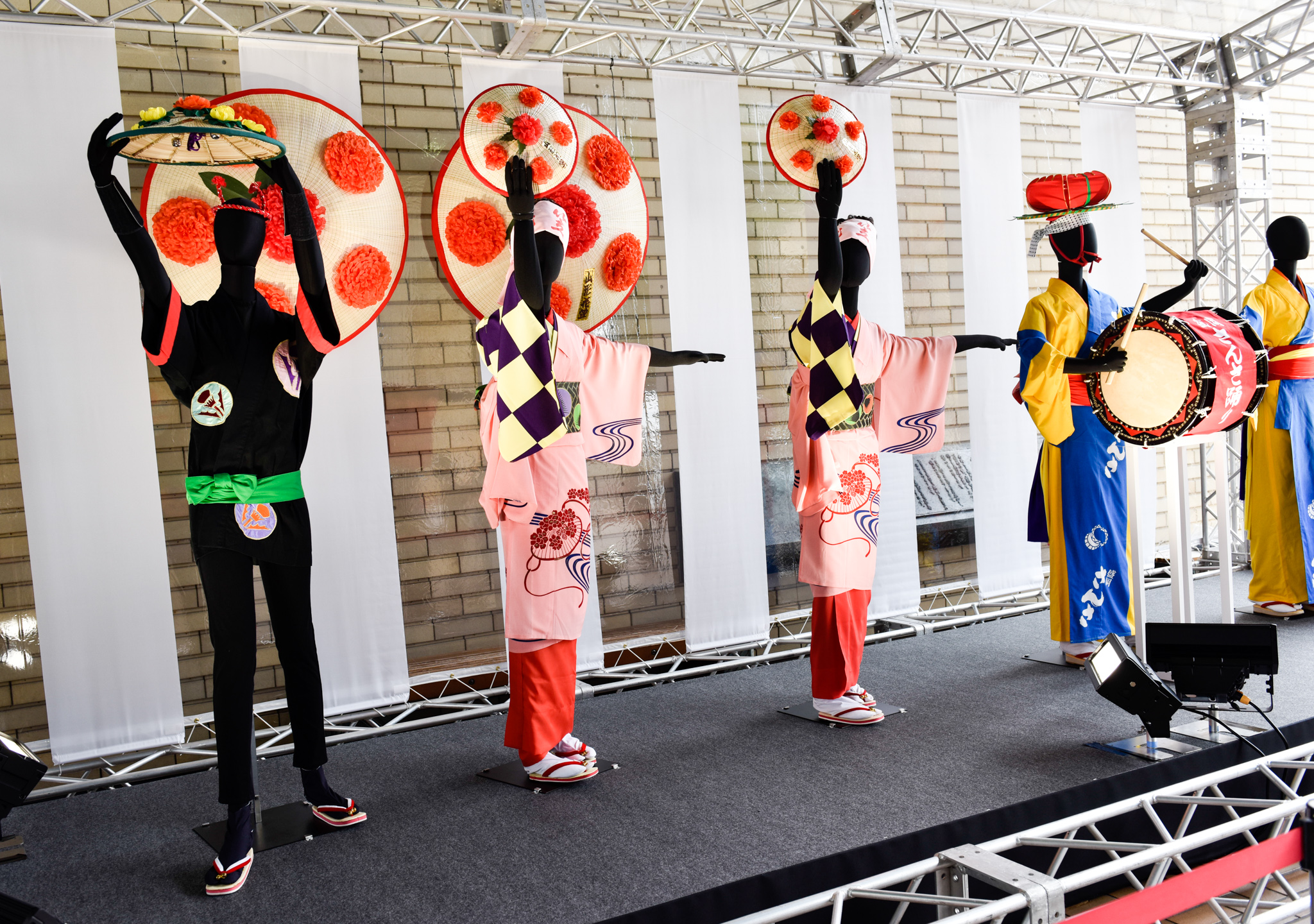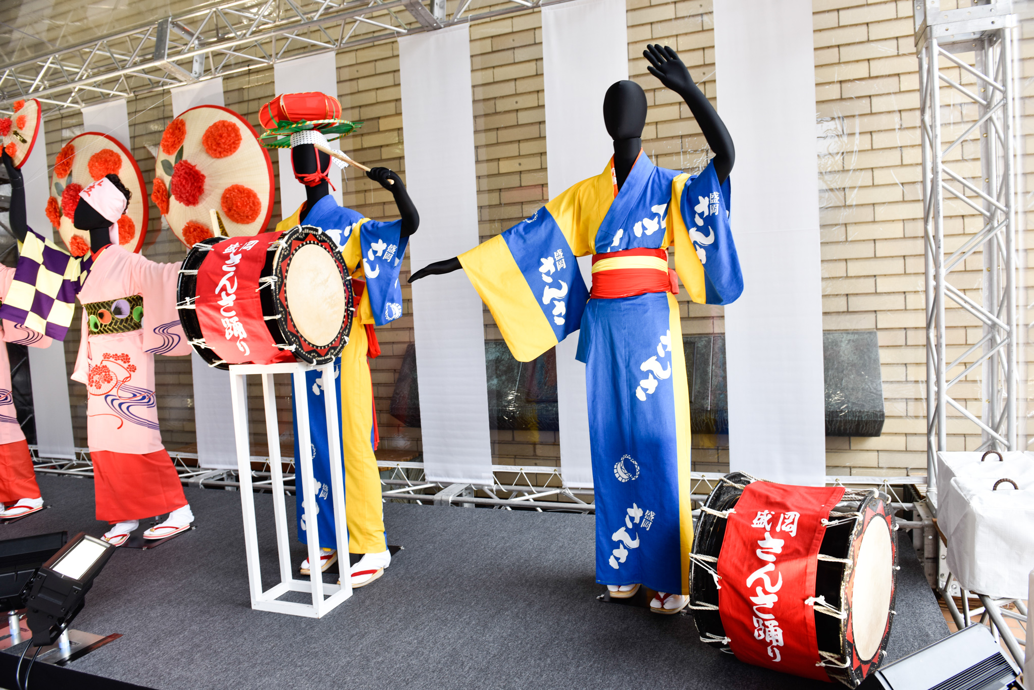 仙台七夕まつりの紹介の横では、山形花笠まつりの紹介が行われていた。2種類の衣装が展示されており、写真中央の2つのピンク色の衣装が山形県を流れる「最上川」が描かれたもので女性用だ。一方で、写真左の黒い衣装は男性が着用するもので、山形県の花である「紅花」をあしらっている。起源は諸説あるが、土木作業時の土突き歌が元になり、蔵王の観光PRとともに広まったとも言われる。開催日は毎年8月5日~7日である。