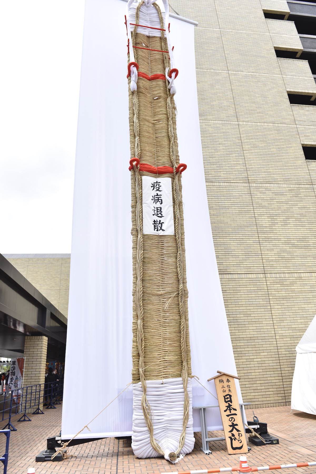 「東北絆まつり2021山形」の展示は、山形市役所の屋外スペースを使って行われた。山形市役所は山形駅から徒歩20分ほどのところにある。静かなビル街でお祭り?と思いながら、現地に到着すると、巨大なわらじが「どん!」と置かれており、会場の場所をすぐに見つけることができた。これが、1県目・福島わらじまつりで実際に使われる日本一の長さを誇る12mの大わらじだ。