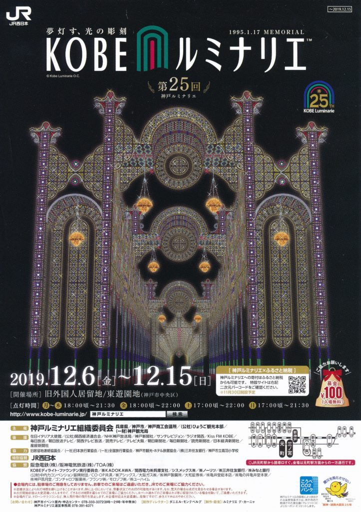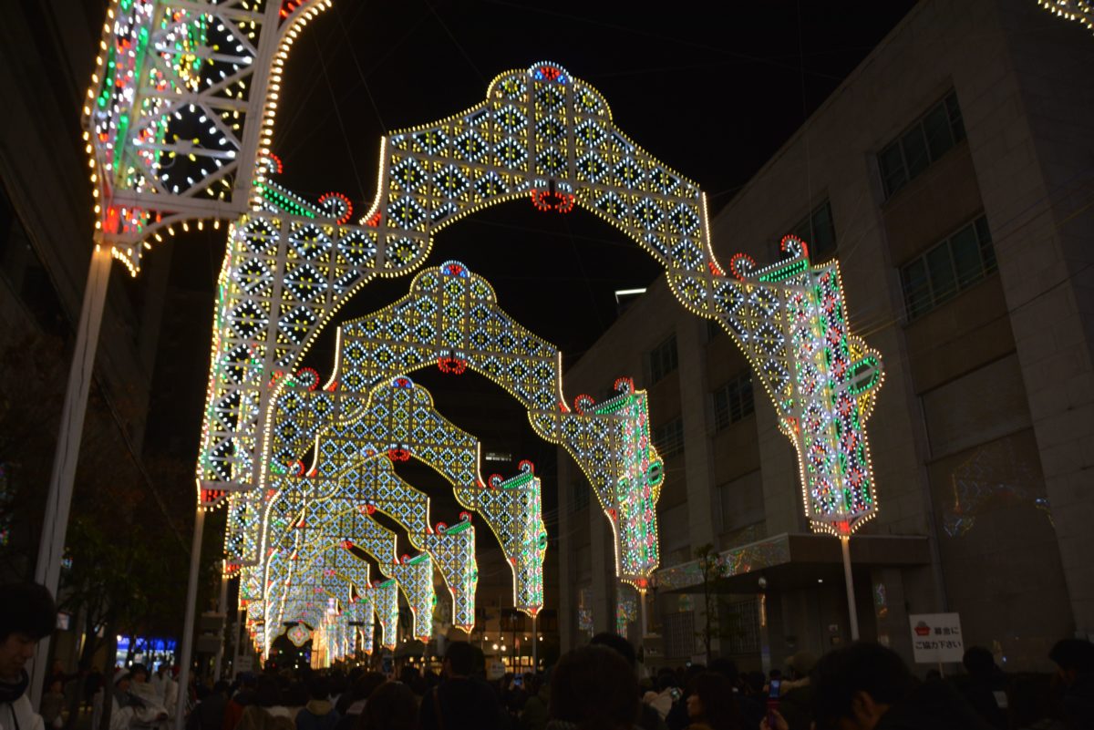 「神戸ルミナリエ」は、阪神・淡路大震災の犠牲者の鎮魂のため、1995年同年の12月に始まり2019年で第25回となります。例年12月の上旬から中旬に、仲町通りと東遊園地広場をメイン会場として行われます。毎年300万人を越える人々が訪れ、神戸の冬の風物詩として定着しています。