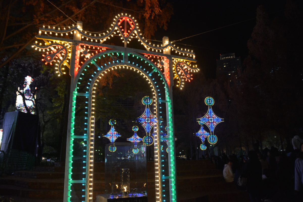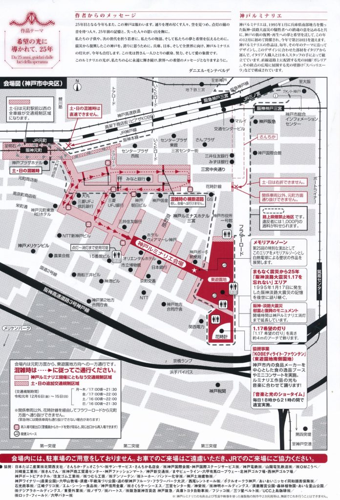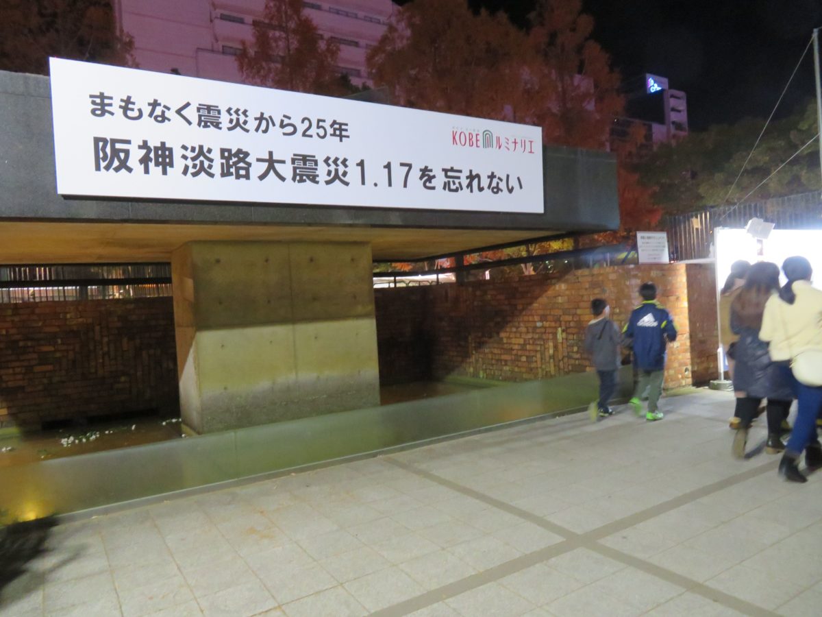 仲町通りの終点は東遊園地広場です。広場は例年、光の聖堂の「カッサアルモニカ」が設置されます。ドームの四方を光の尖塔が聳え立ち、宮殿のような空間を創り上げています。広場の慰霊と復興のゾーンは、「1.17希望の灯り」で飾られました。