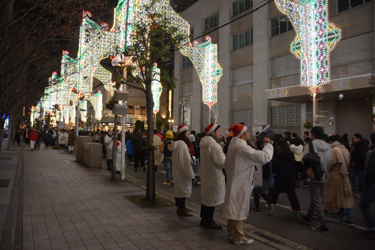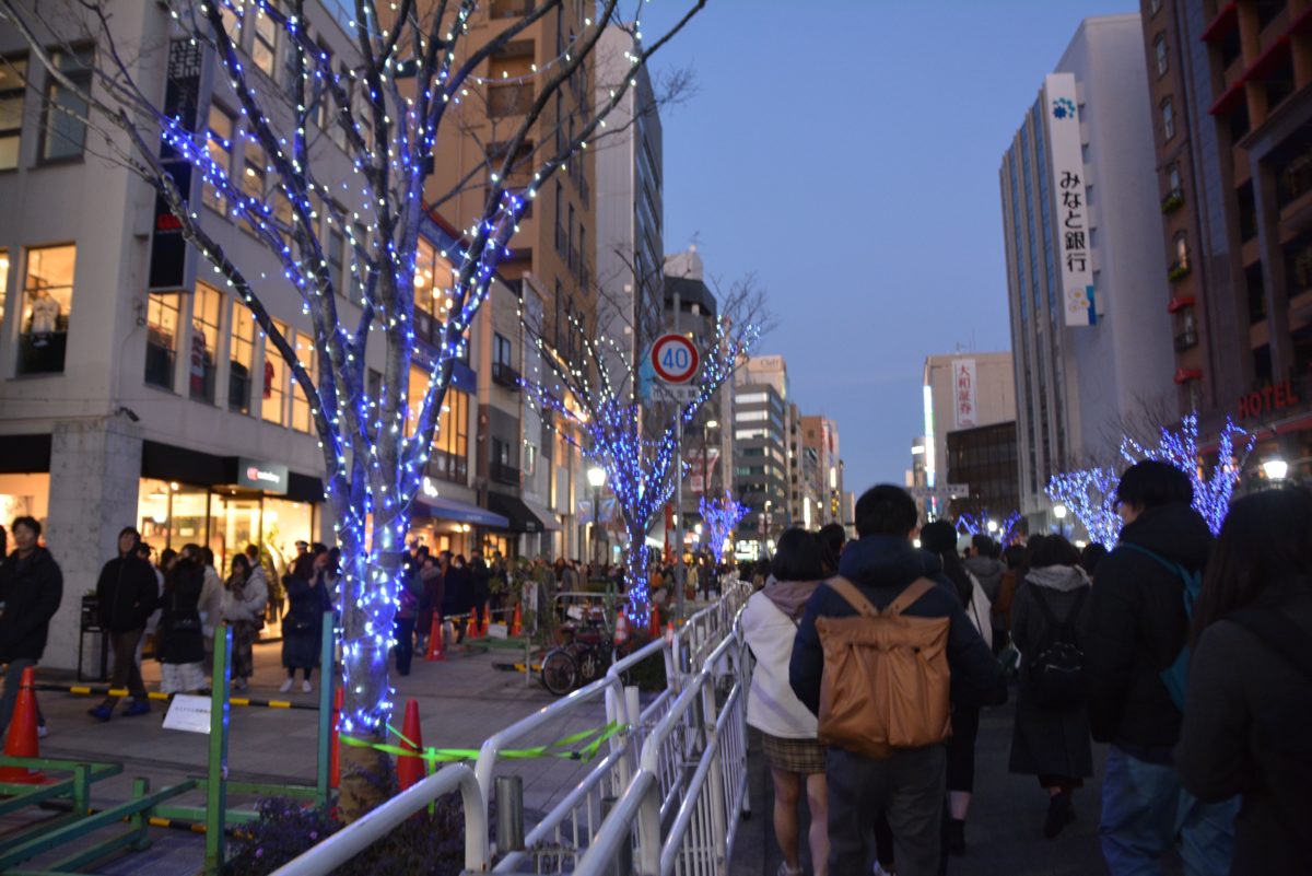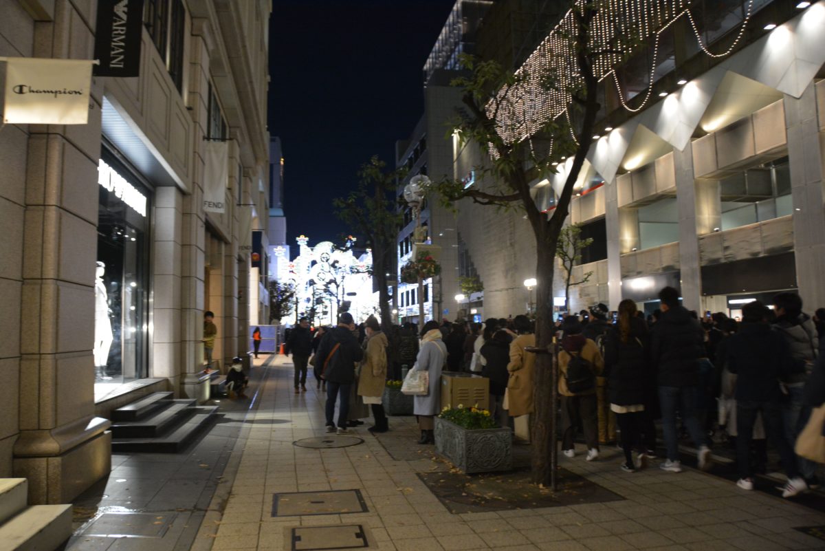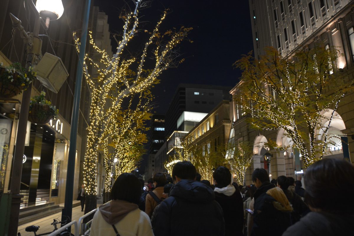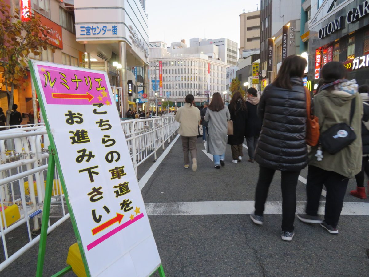 イルミネーション点灯の1時間前から長蛇の行列が続く元町駅前から仲町通り