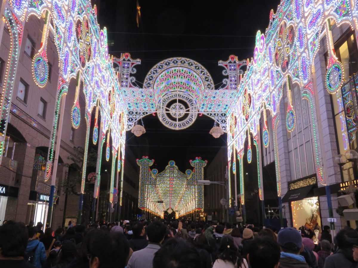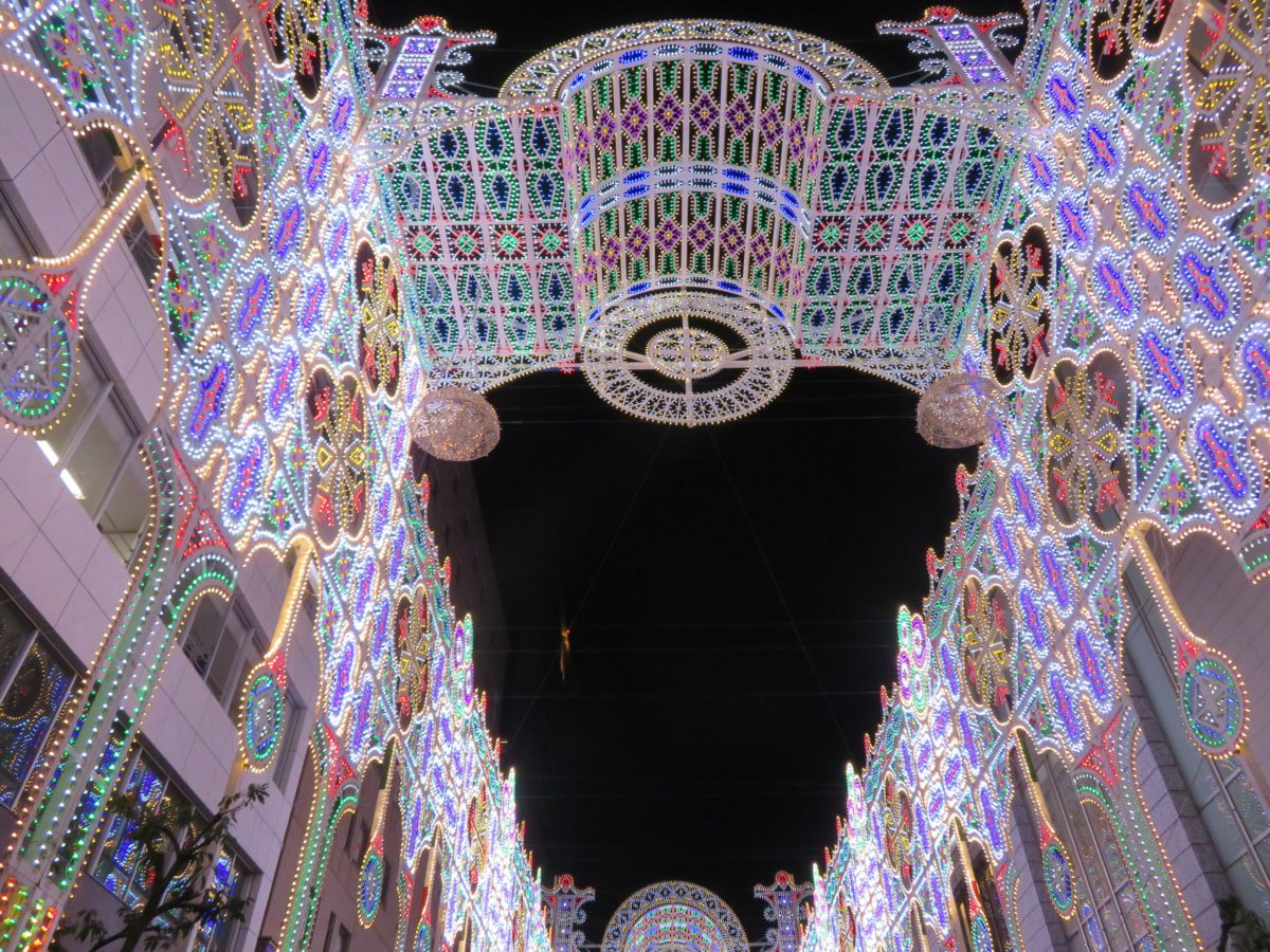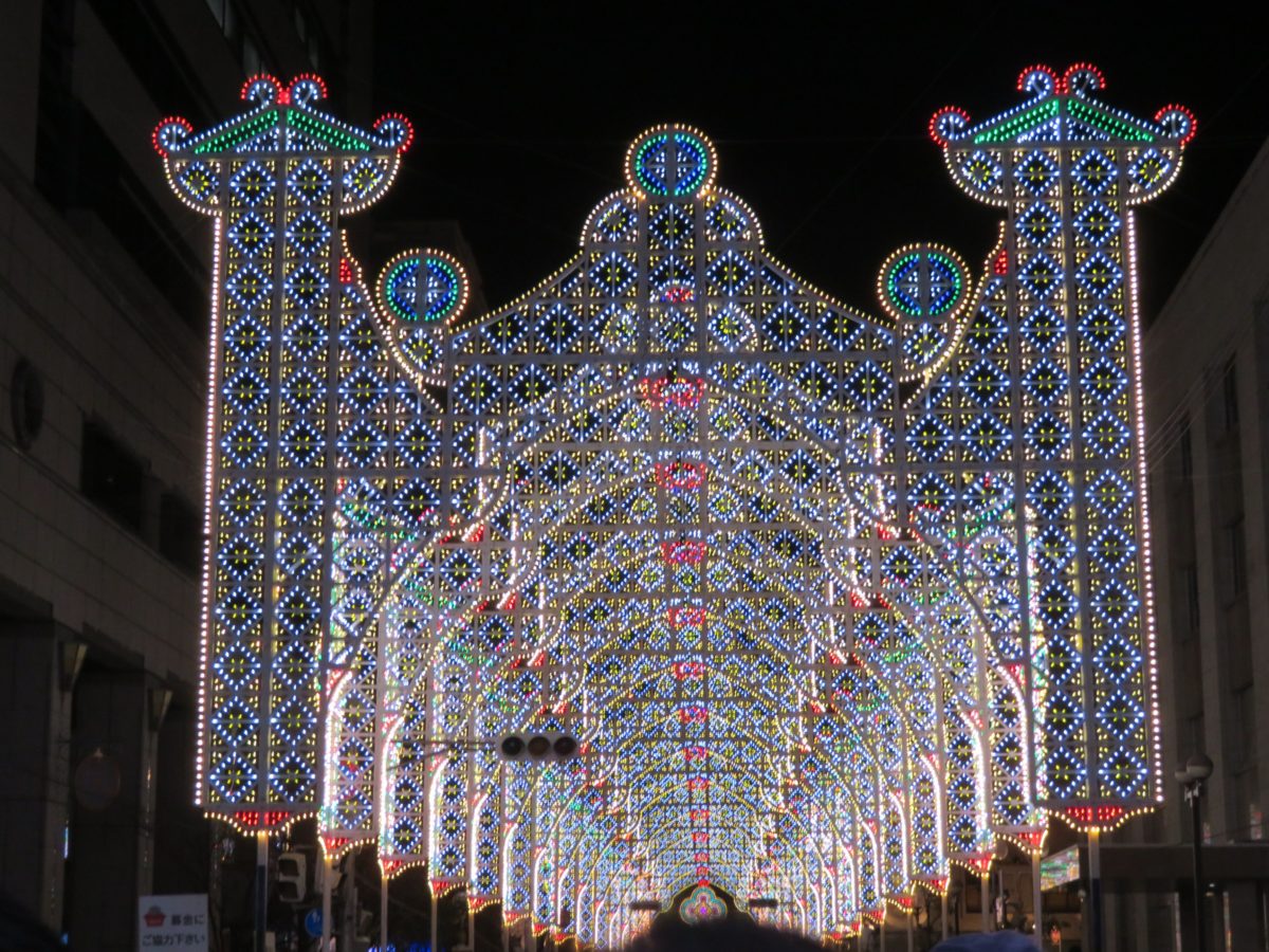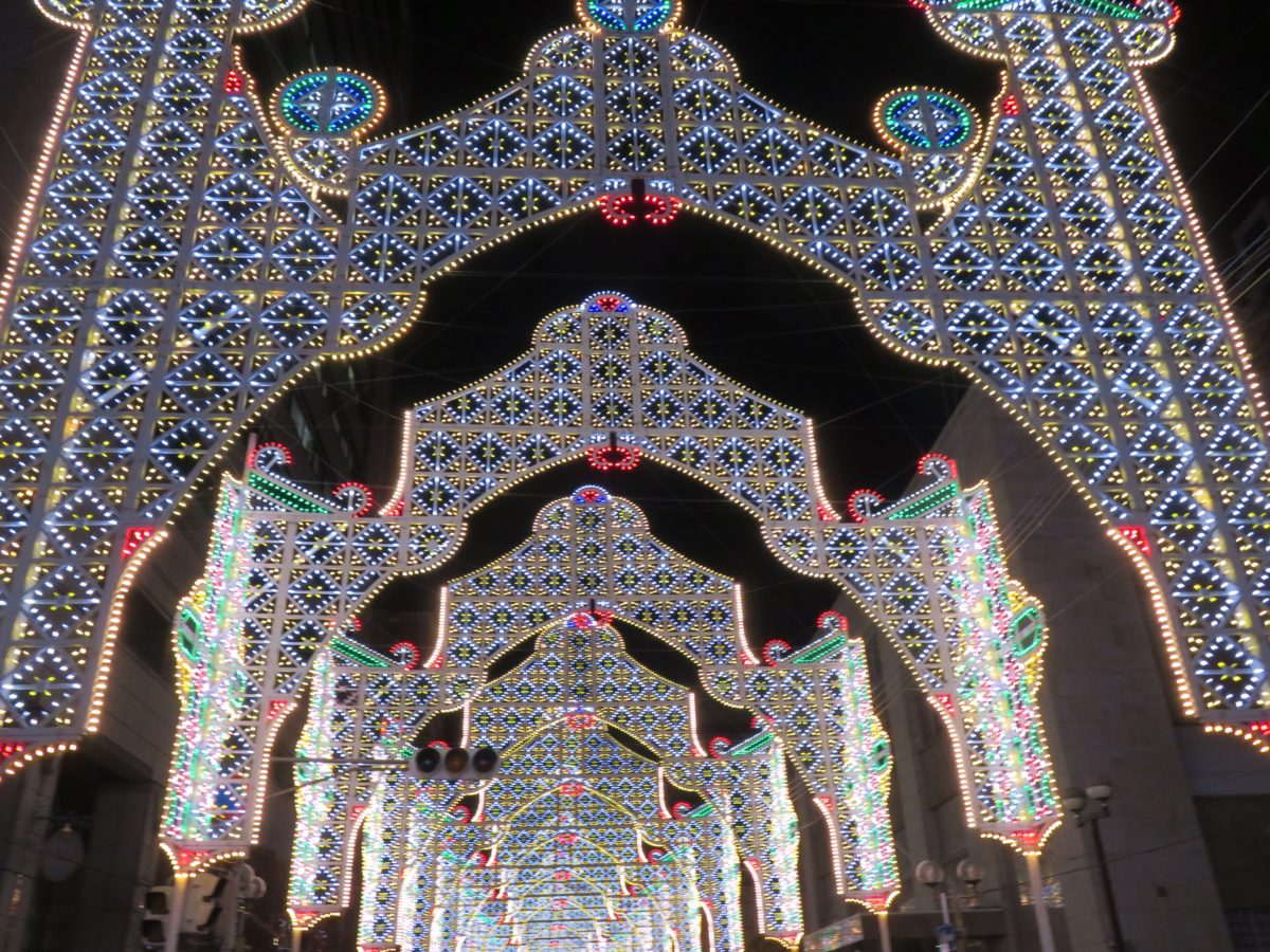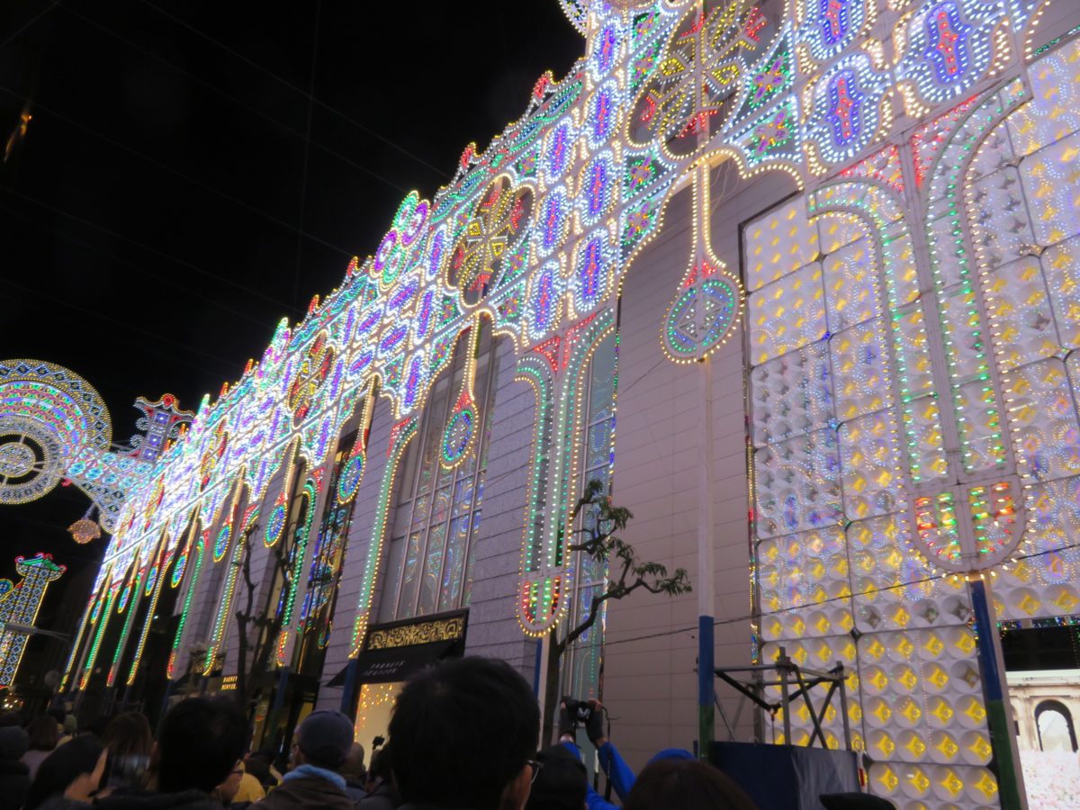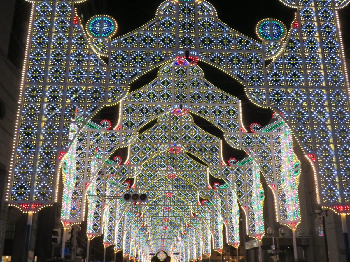 メインイルミネーションの起点となるのは、仲町通りが浪花町筋と交差するポイントです。高さ約22メートルの「フロントーネ」が眩しく輝きます。巨大な3連のアーチが「スパッリエーラ」の入口となります。「スパッリエーラ」は浪花町筋から京町筋までの約50メートルの光の回廊です。京町筋からは「ガレリア」が続き、総延長約270メートルにわたって降り注ぐ鮮やかな光に圧倒されない人はいないでしょう。ただ立ち止まることは許されず、ゆっくりと歩きながらの鑑賞となります。