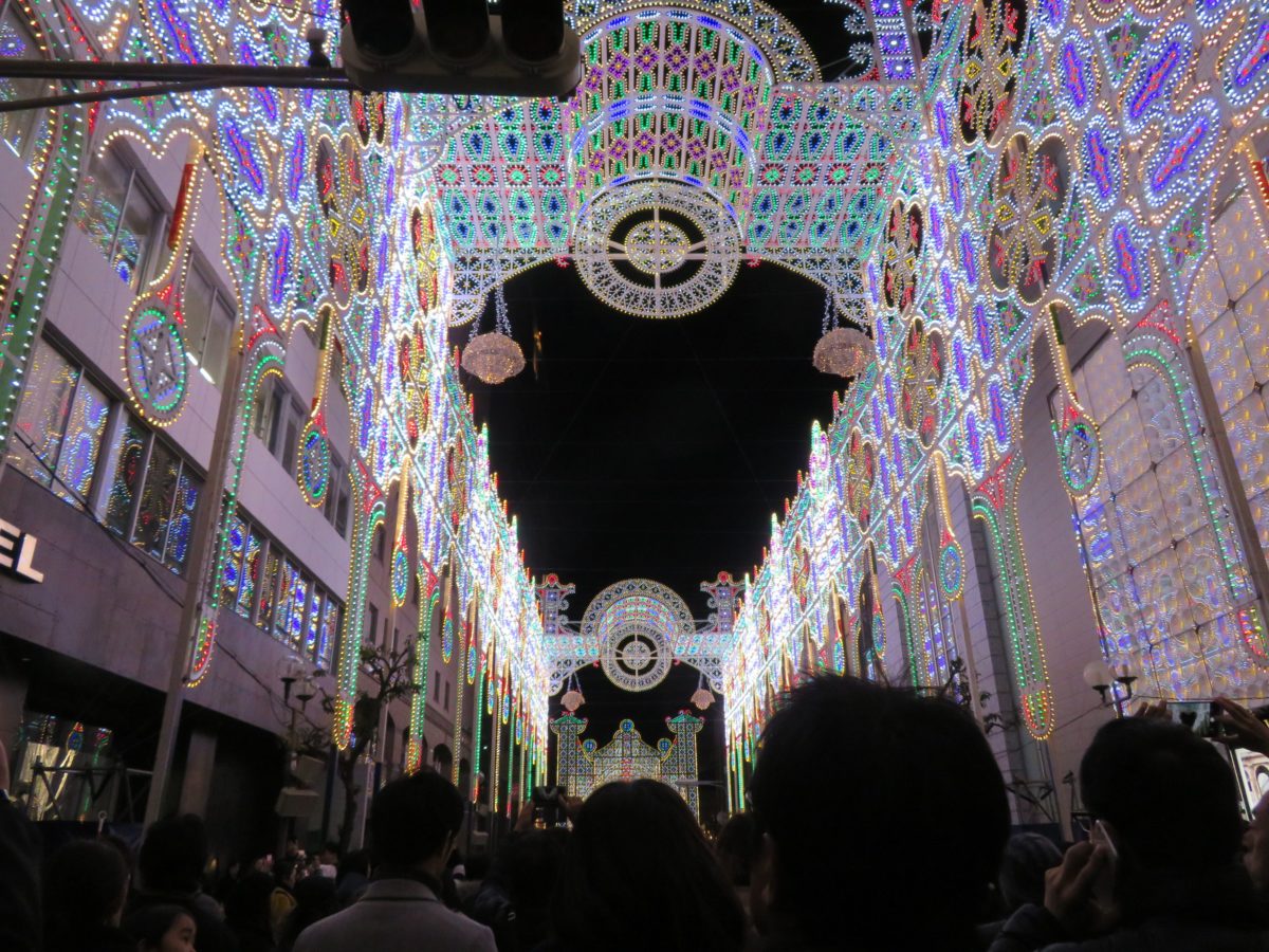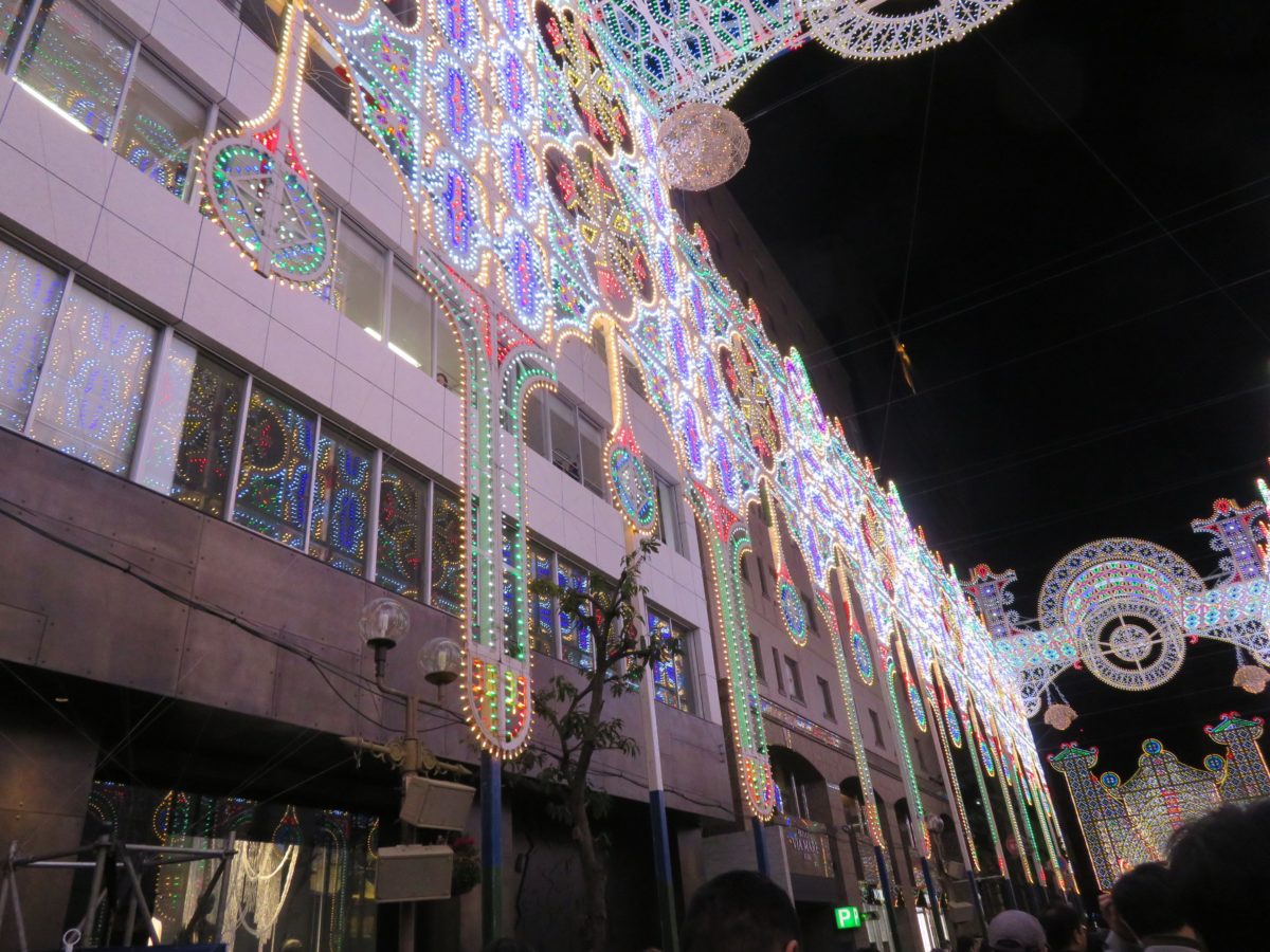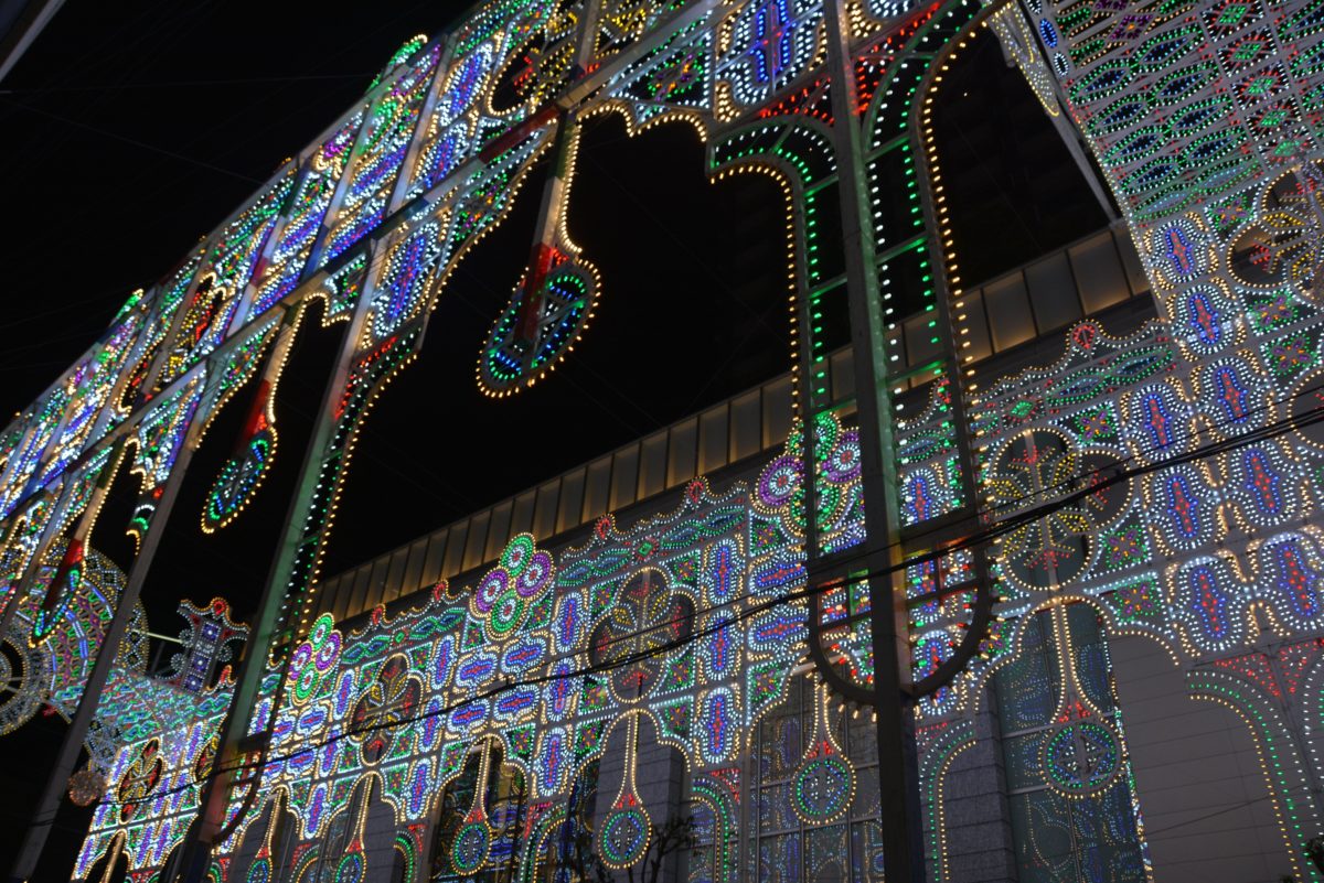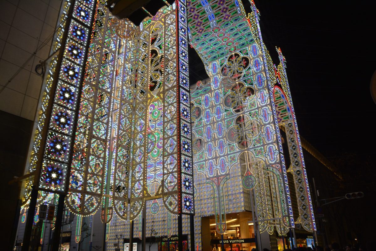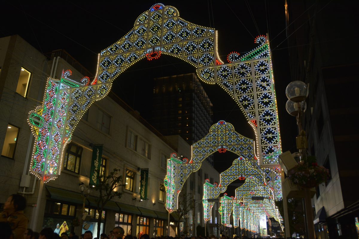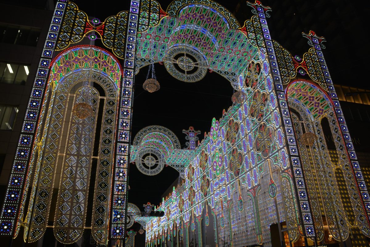 メインイルミネーションの起点となるのは、仲町通りが浪花町筋と交差するポイントです。高さ約22メートルの「フロントーネ」が眩しく輝きます。巨大な3連のアーチが「スパッリエーラ」の入口となります。「スパッリエーラ」は浪花町筋から京町筋までの約50メートルの光の回廊です。京町筋からは「ガレリア」が続き、総延長約270メートルにわたって降り注ぐ鮮やかな光に圧倒されない人はいないでしょう。ただ立ち止まることは許されず、ゆっくりと歩きながらの鑑賞となります。
