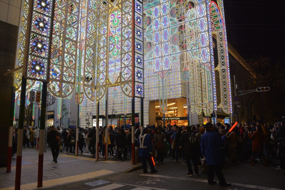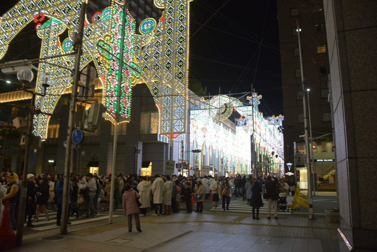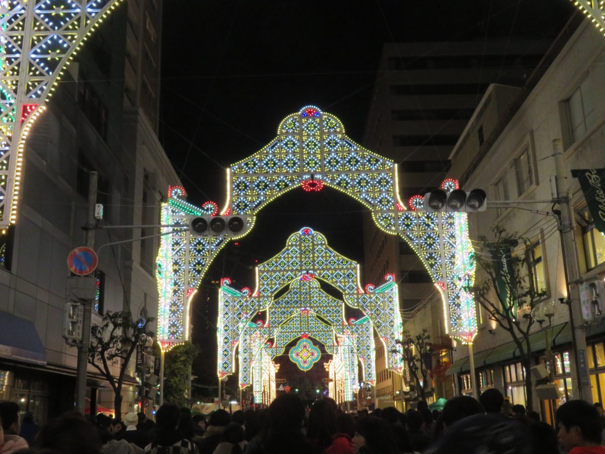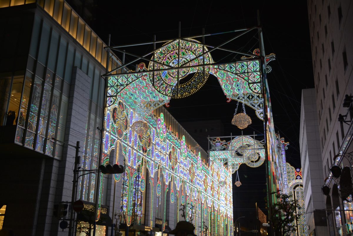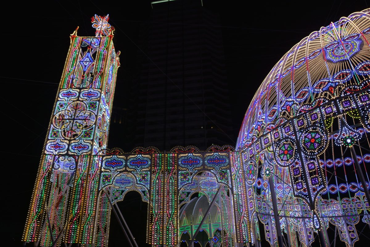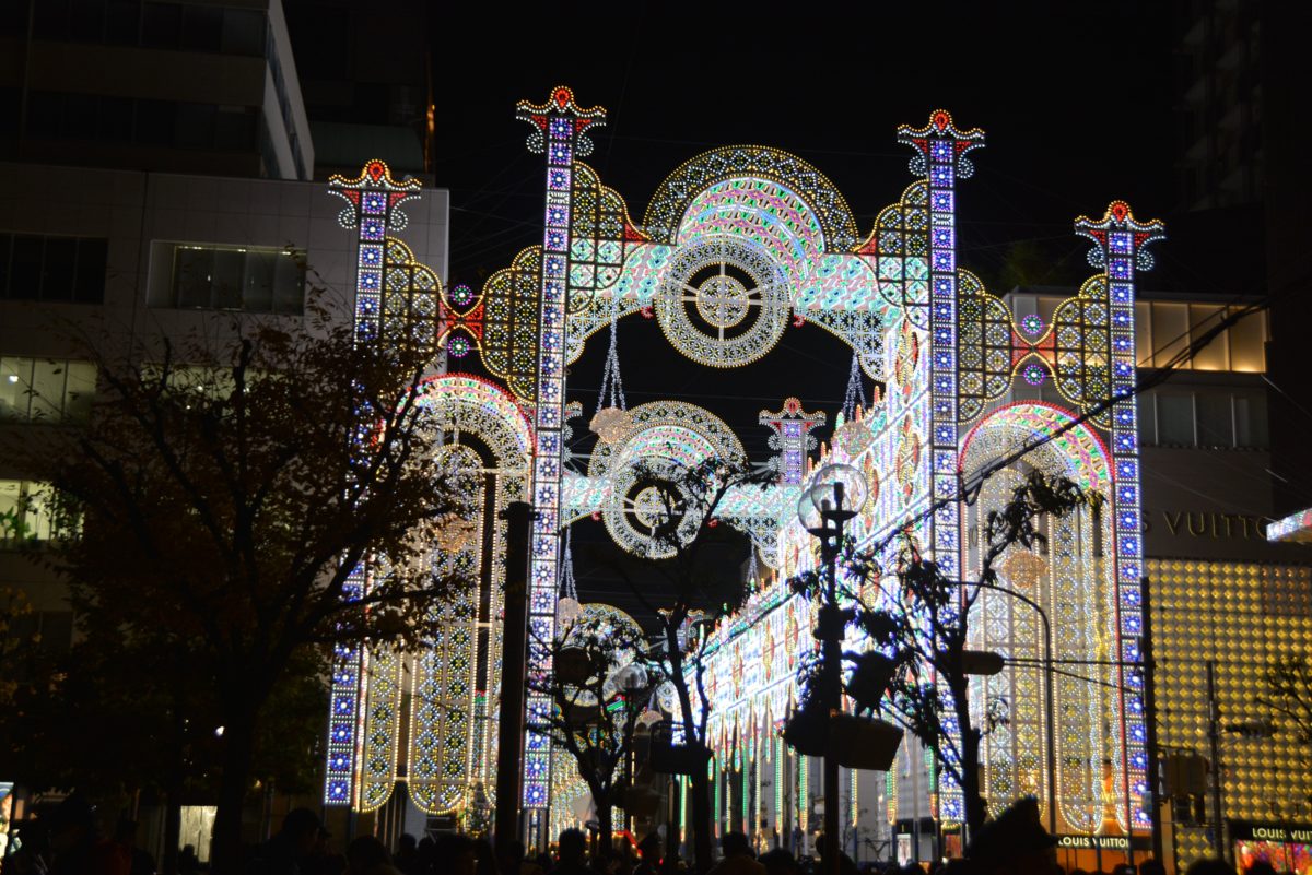 メインイルミネーションの起点となるのは、仲町通りが浪花町筋と交差するポイントです。高さ約22メートルの「フロントーネ」が眩しく輝きます。巨大な3連のアーチが「スパッリエーラ」の入口となります。「スパッリエーラ」は浪花町筋から京町筋までの約50メートルの光の回廊です。京町筋からは「ガレリア」が続き、総延長約270メートルにわたって降り注ぐ鮮やかな光に圧倒されない人はいないでしょう。ただ立ち止まることは許されず、ゆっくりと歩きながらの鑑賞となります。