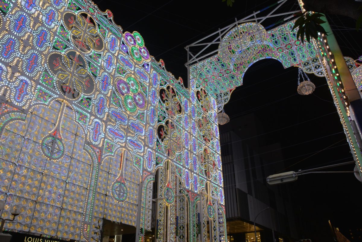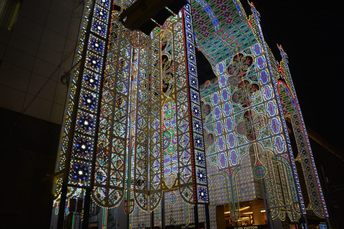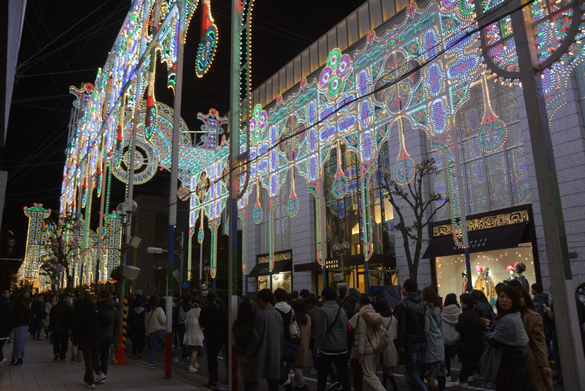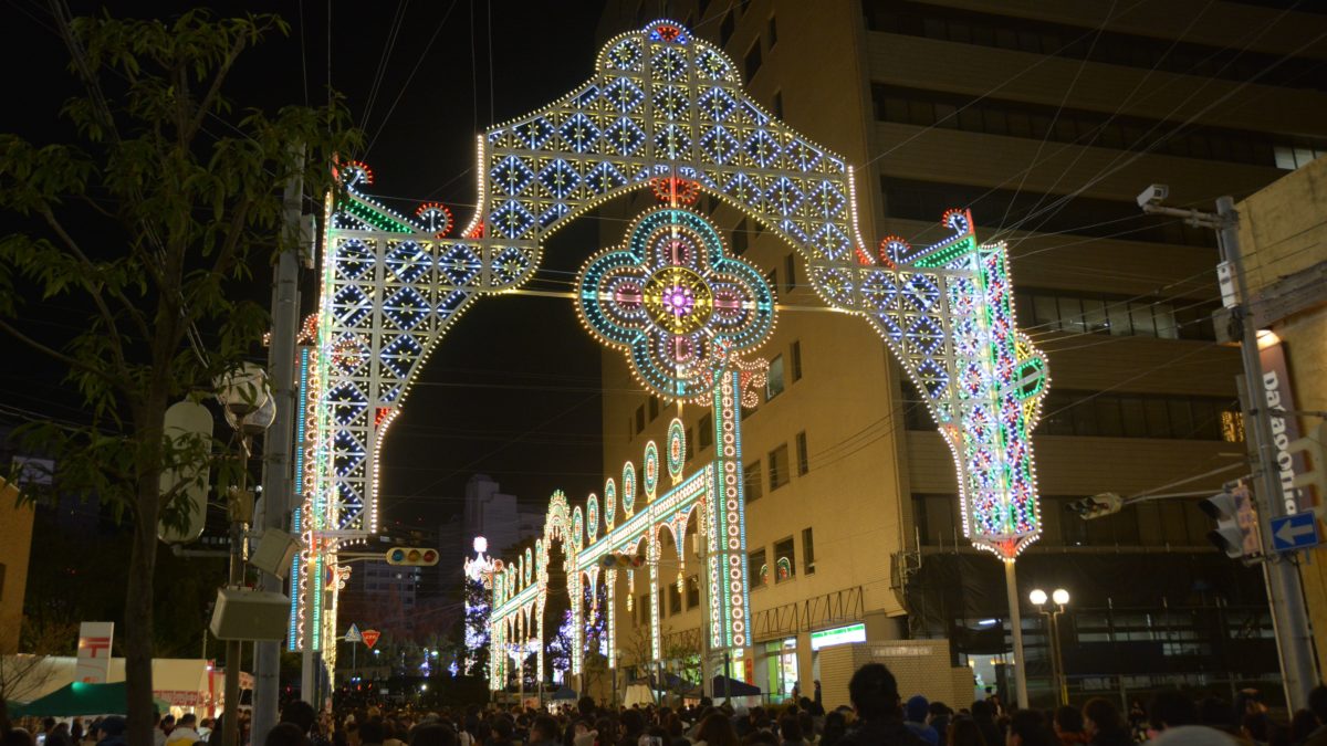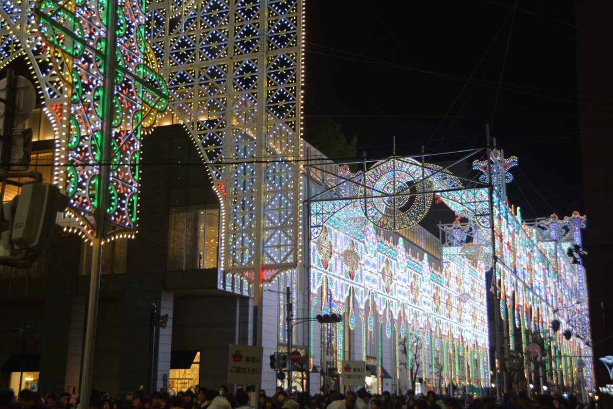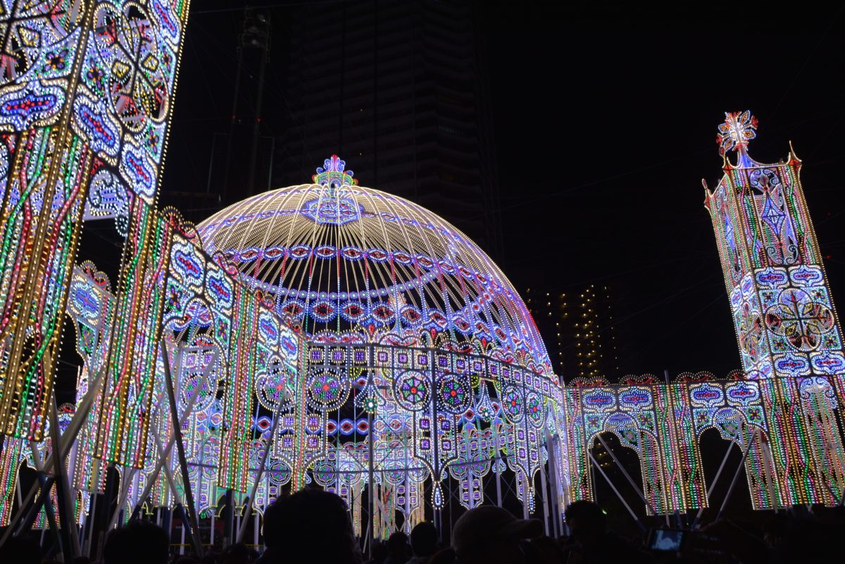 メインイルミネーションの起点となるのは、仲町通りが浪花町筋と交差するポイントです。高さ約22メートルの「フロントーネ」が眩しく輝きます。巨大な3連のアーチが「スパッリエーラ」の入口となります。「スパッリエーラ」は浪花町筋から京町筋までの約50メートルの光の回廊です。京町筋からは「ガレリア」が続き、総延長約270メートルにわたって降り注ぐ鮮やかな光に圧倒されない人はいないでしょう。ただ立ち止まることは許されず、ゆっくりと歩きながらの鑑賞となります。