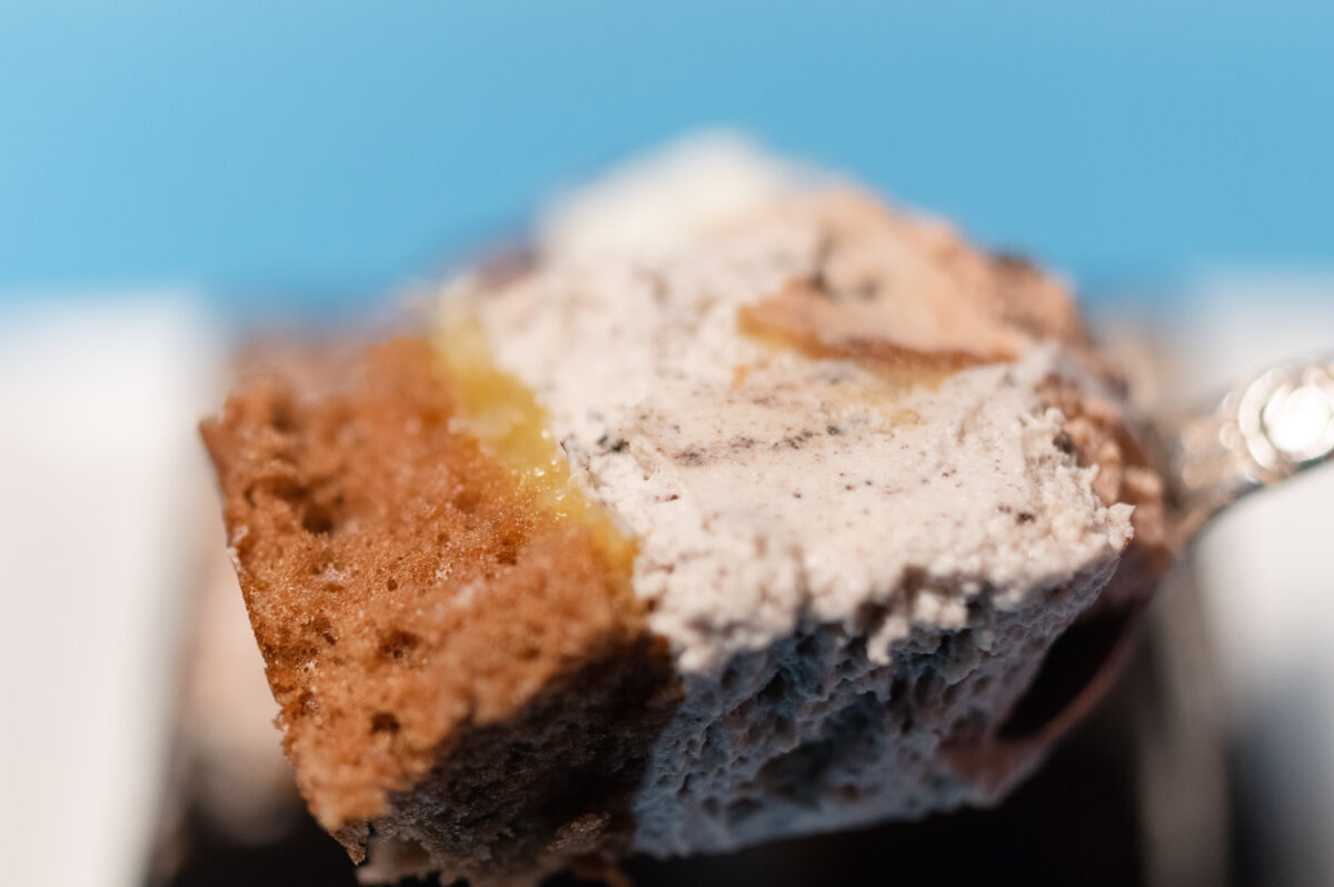 食べ進めていくと、上の2/3程がクリームの層。下の1/3程がココアスポンジとなっています。さらにココアスポンジとクリームの間は、濃厚なバナナソースやもっちりとしたマシュマロが……。お子様が大好きな食材をギュッと集めた、休日の児童公園のように賑やかで楽しいケーキです。