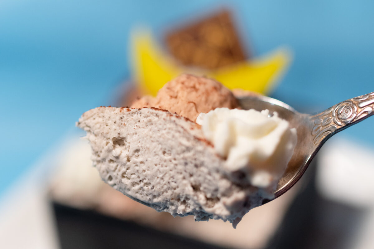 はじめに「こどもの日かわいいかぶとケーキ」を実食。スプーンでさっくとすくってみると、ふんわりとした食感のチョコクリームに、アーモンドクッキークランチ入りホイップクリーム。はじめの一口で、香り豊かなチョコレートと、香ばしいアーモンドの風味を同時に楽しめます。