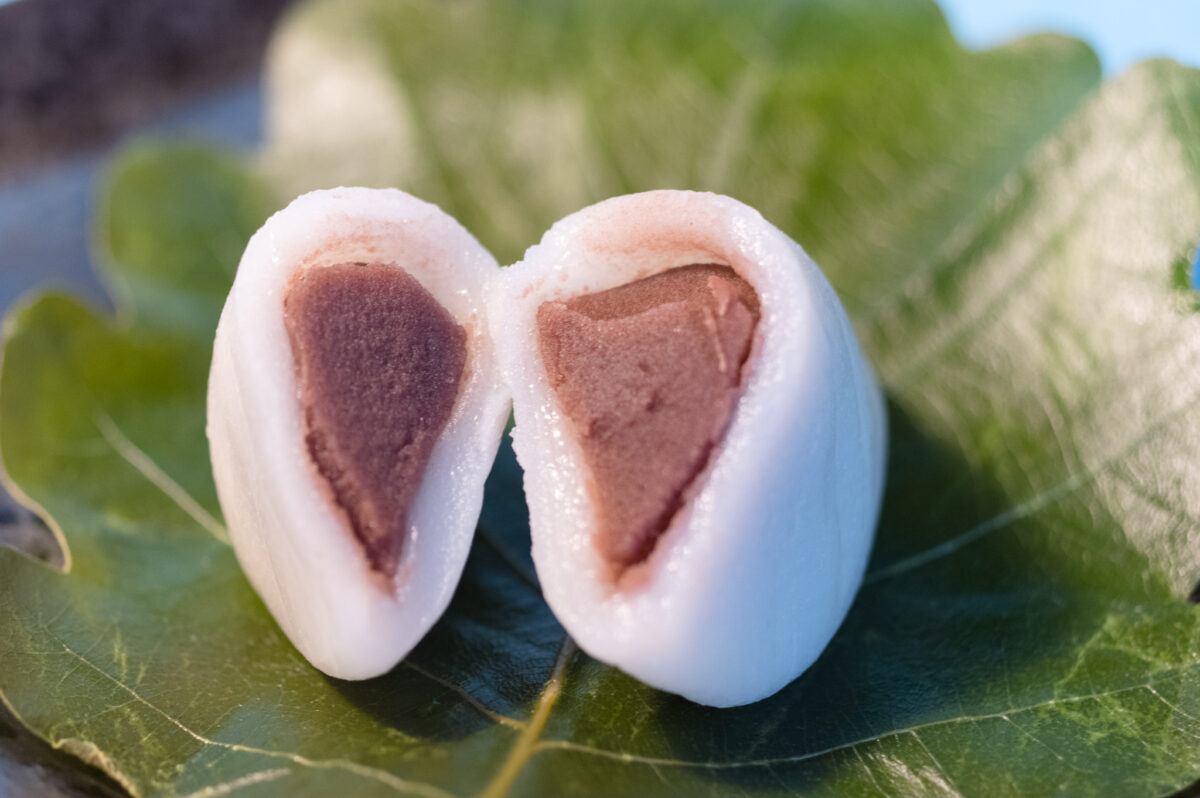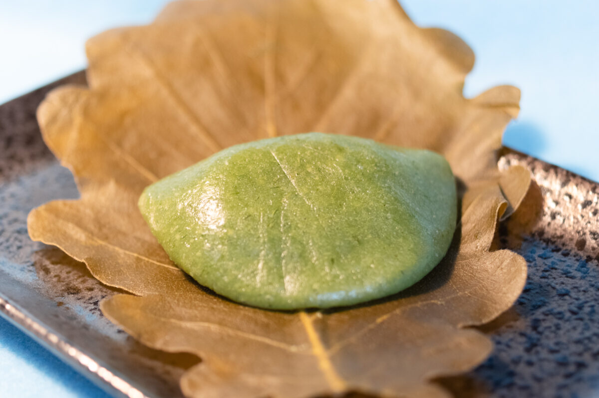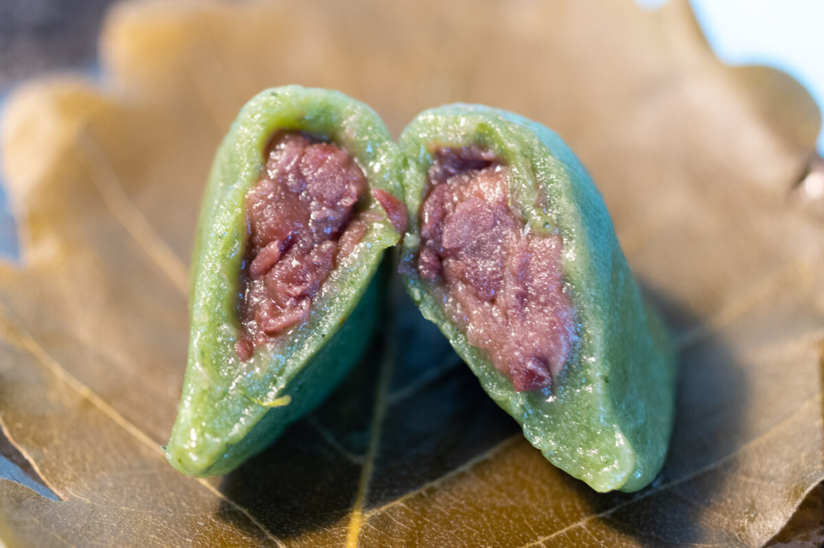 深い緑色の生地は、やわらかく快い食感。みずみずしい粒餡が印象的。香り高いよもぎの味わいに、柏葉の香りが重なることで、より若葉の緑鮮やかな季節を堪能できます。