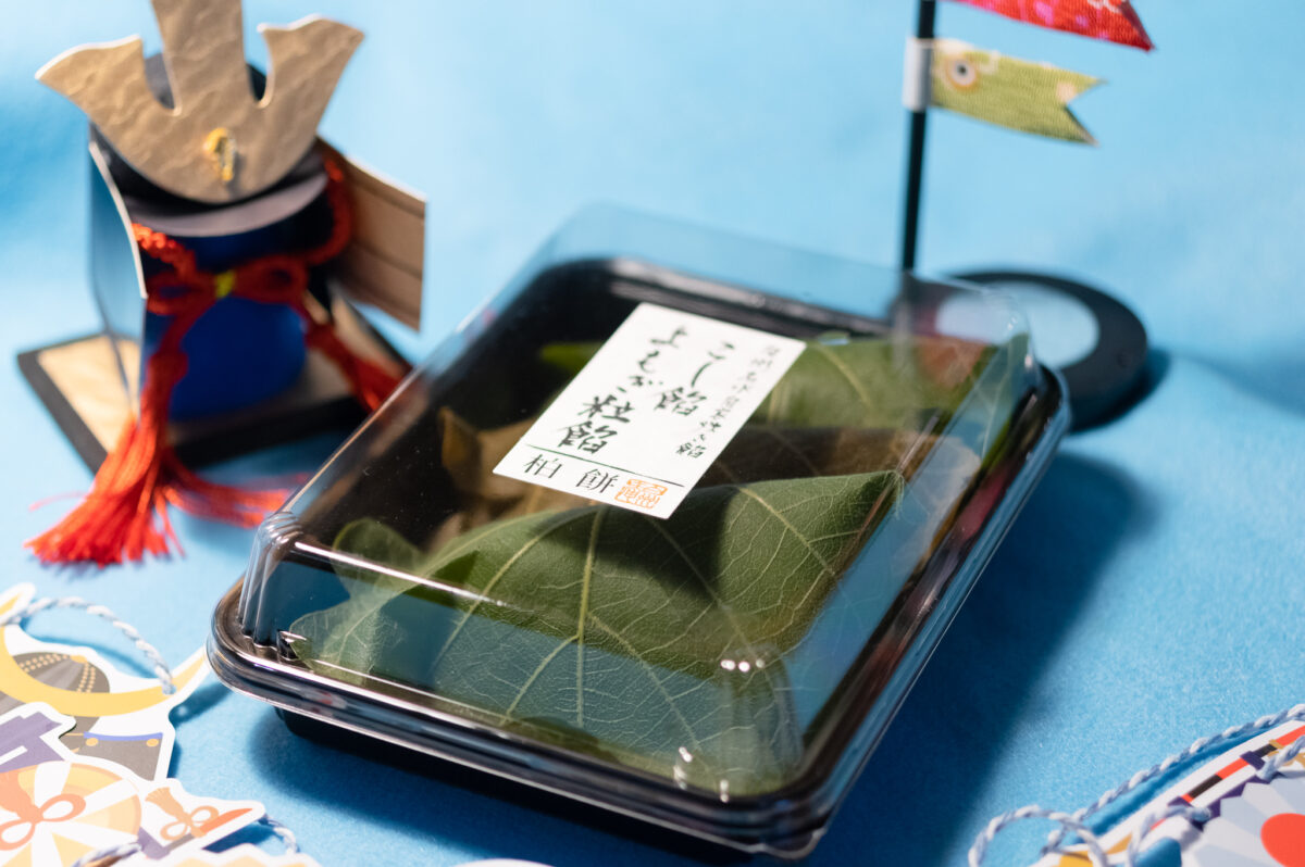 次に「特選柏餅・こし餡」を実食。こし餡をなめらかで弾力のある白い生地で包み、緑色の柏葉で巻いた柏餅。柏葉を使用する理由は諸説ありますが、その一つは抗菌、防腐作用。他にも、柏の特徴として新芽が出るまで古い葉が落ちないことから、子孫繁栄・家系が絶えないという縁起物として好まれたという説もあります。
