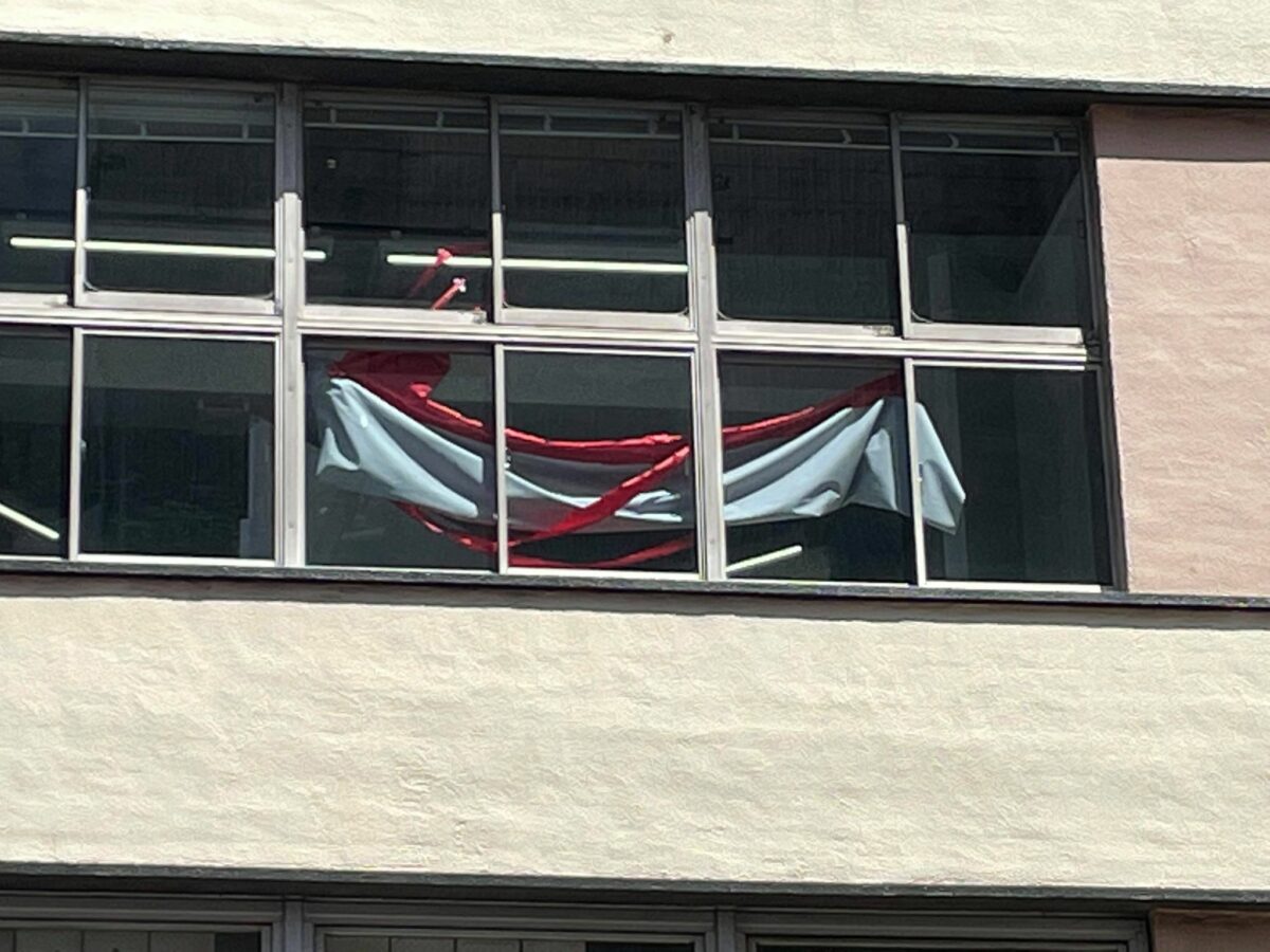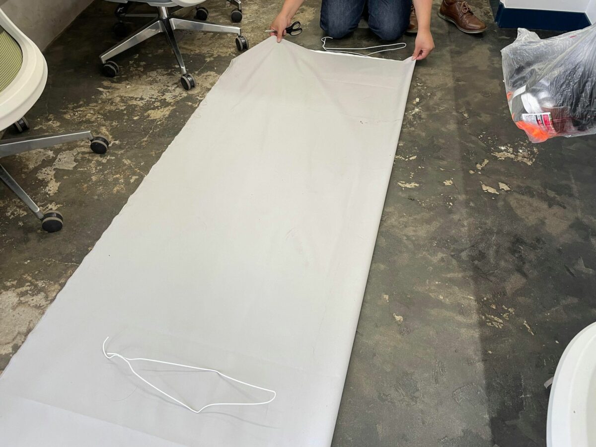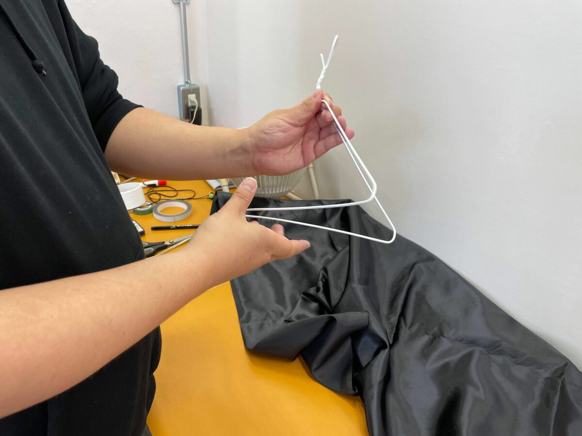 2.5m×1mのグレーの布を二つ折りにし、フクロウナギ同様ハンガーを留めていく