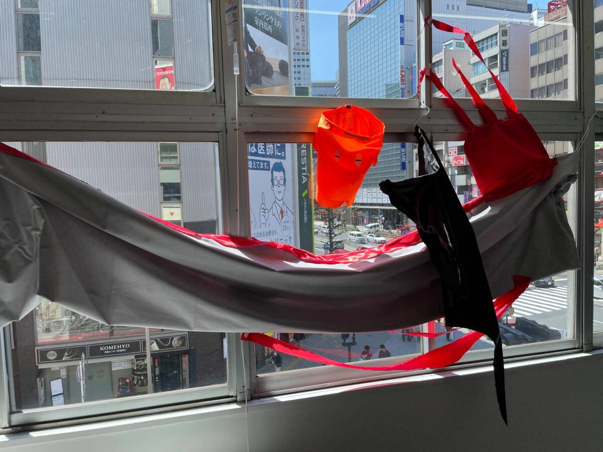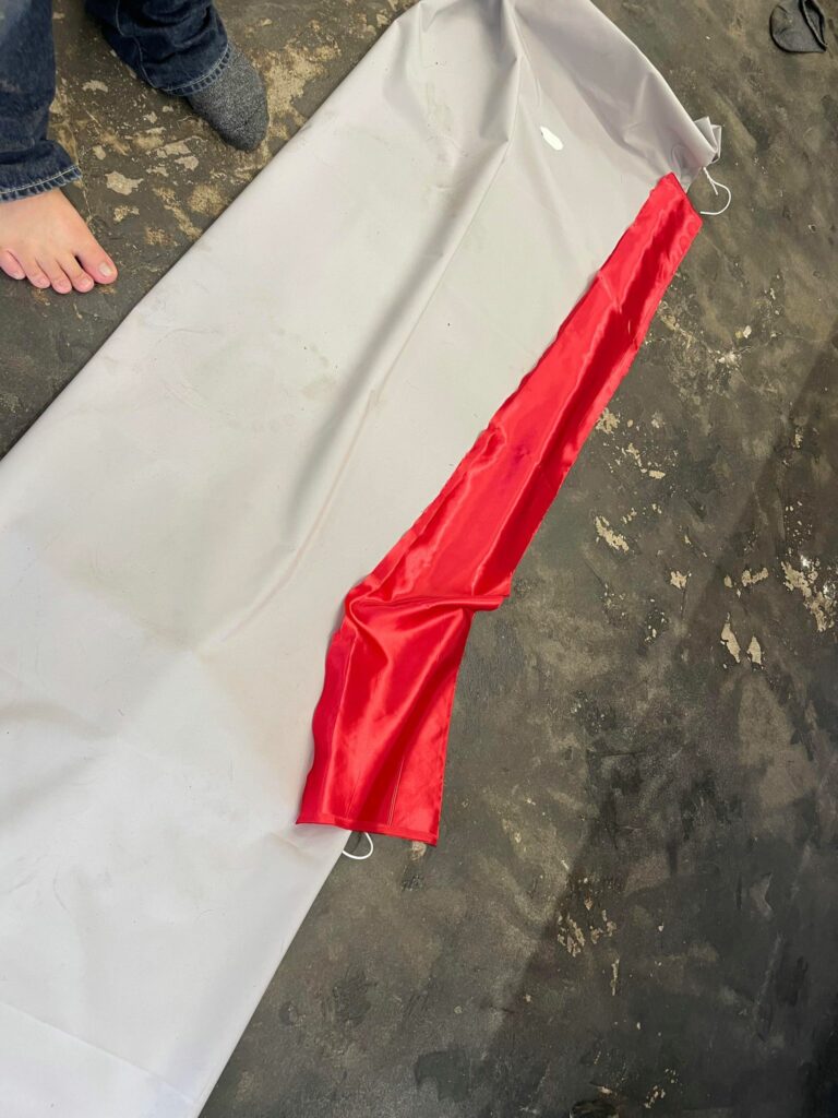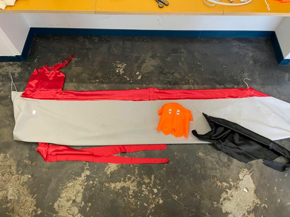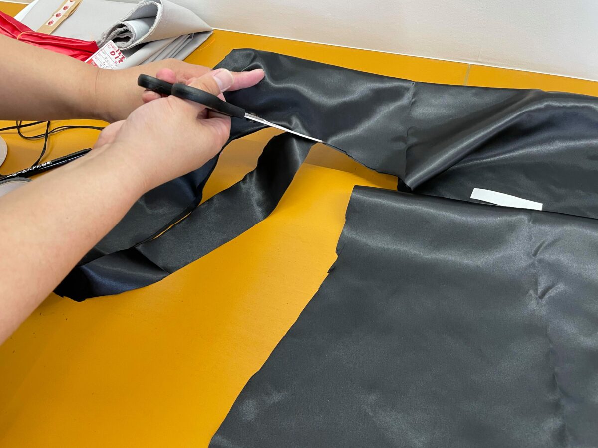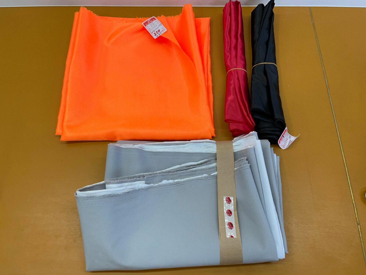 光沢あるグレーの布を2.5mほどと、赤・黒・オレンジの端切れを購入。サテン地で結構質感もいい。
