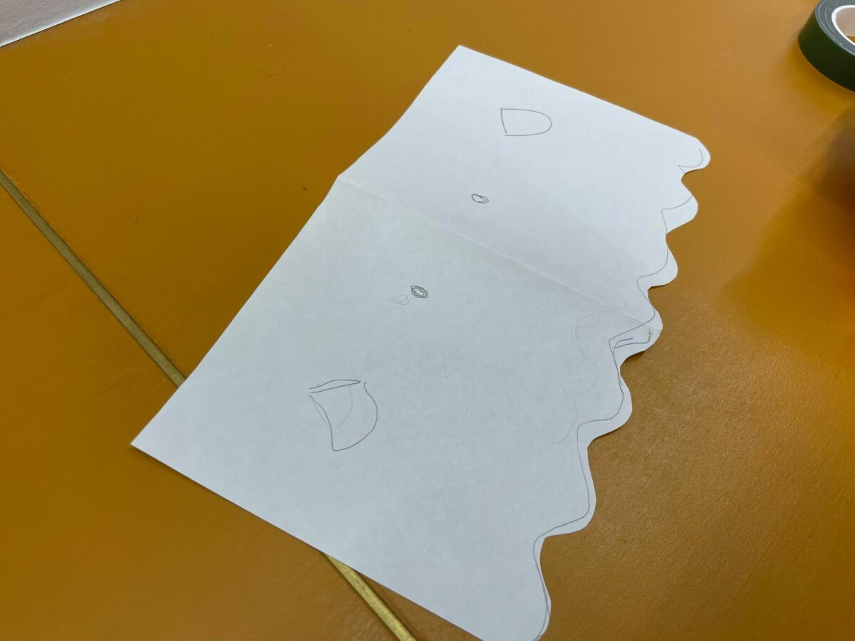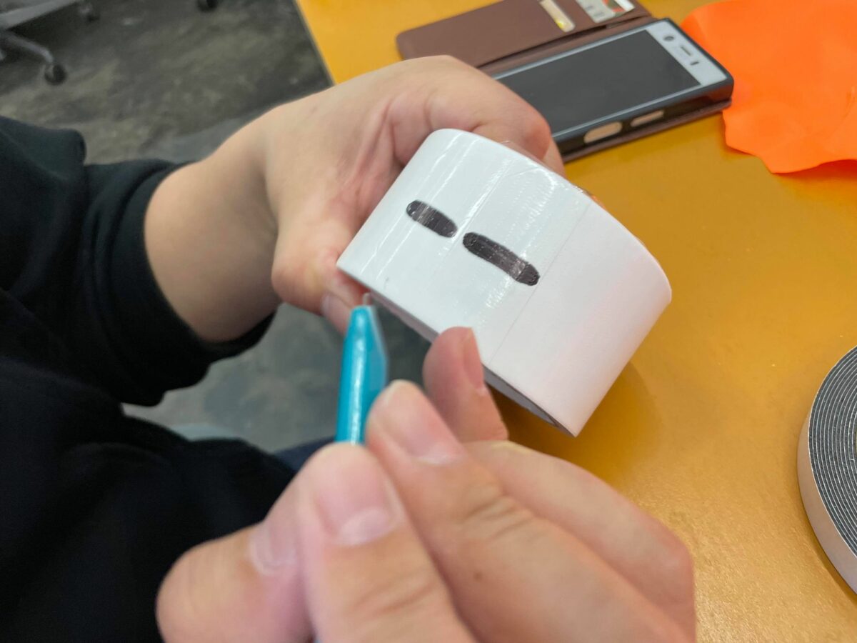 白ガムテは発色がいいので結構便利。眠そうな瞳を書いて楕円に切り出す。