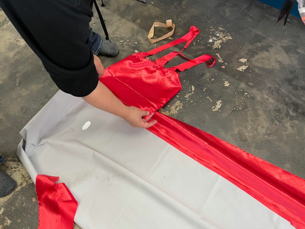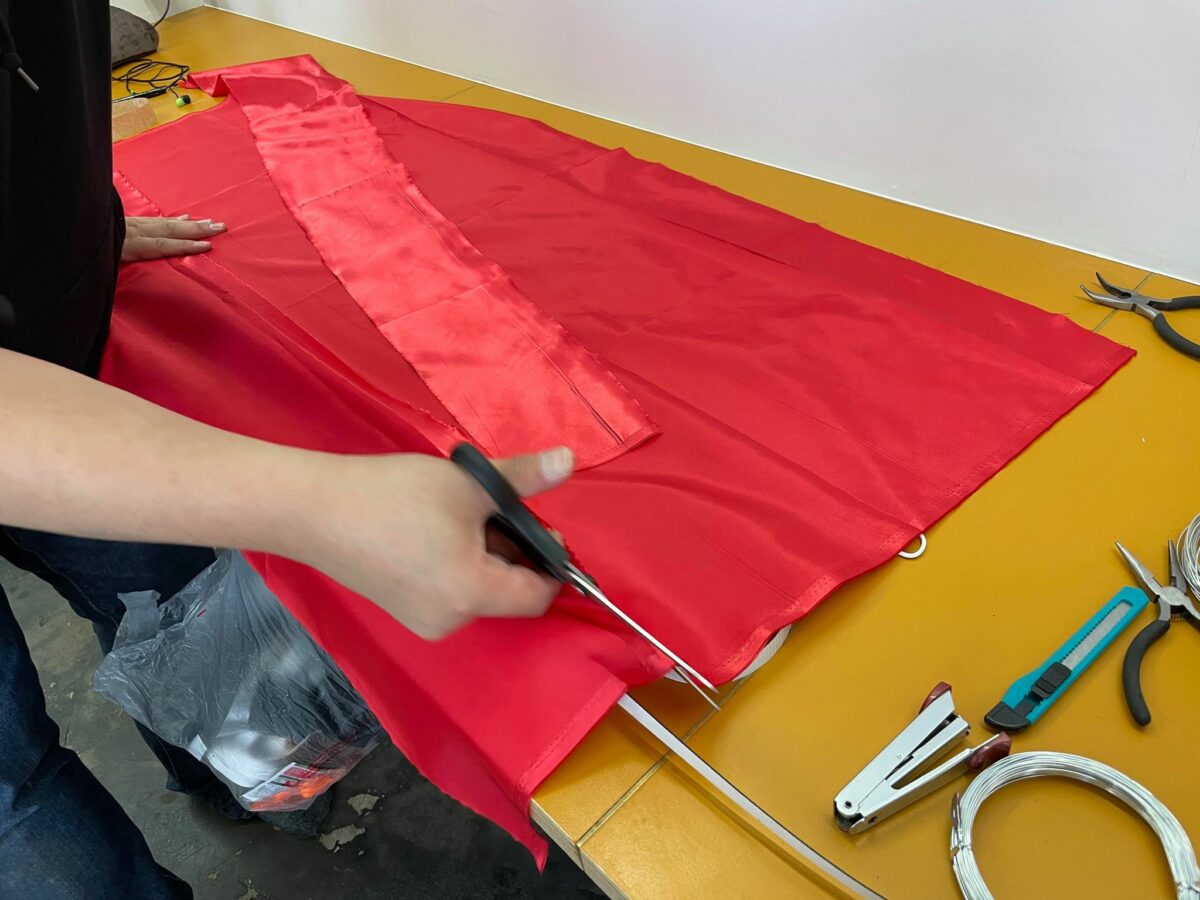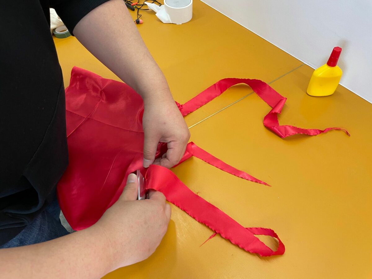 赤い端切れを帯状に切り裂き、二つ折りにした小口をカバーしていく。